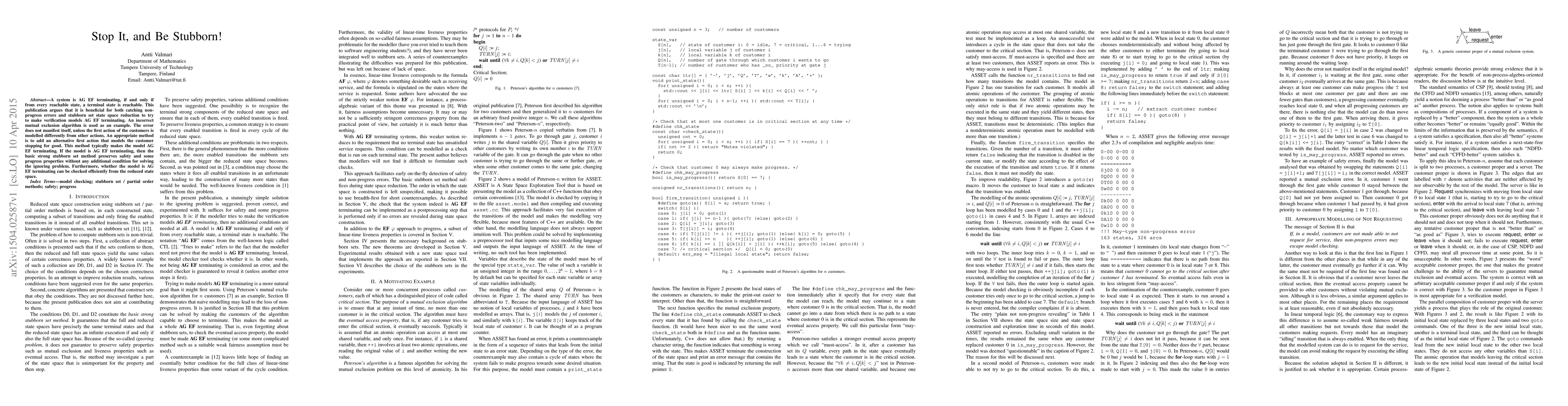 A system is AG EF terminating, if and only if from every reachable state, a terminal state is reachable. This publication argues that it is beneficial for both catching non-progress errors and stubborn set state space reduction to try to make verification models AG EF terminating. An incorrect mutual exclusion algorithm is used as an example. The error does not manifest itself, unless the first action of the customers is modelled differently from other actions. An appropriate method is to add an alternative first action that models the customer stopping for good. This method typically makes the model AG EF terminating. If the model is AG EF terminating, then the basic strong stubborn set method preserves safety and some progress properties without any additional condition for solving the ignoring problem. Furthermore, whether the model is AG EF terminating can be checked efficiently from the reduced state space.