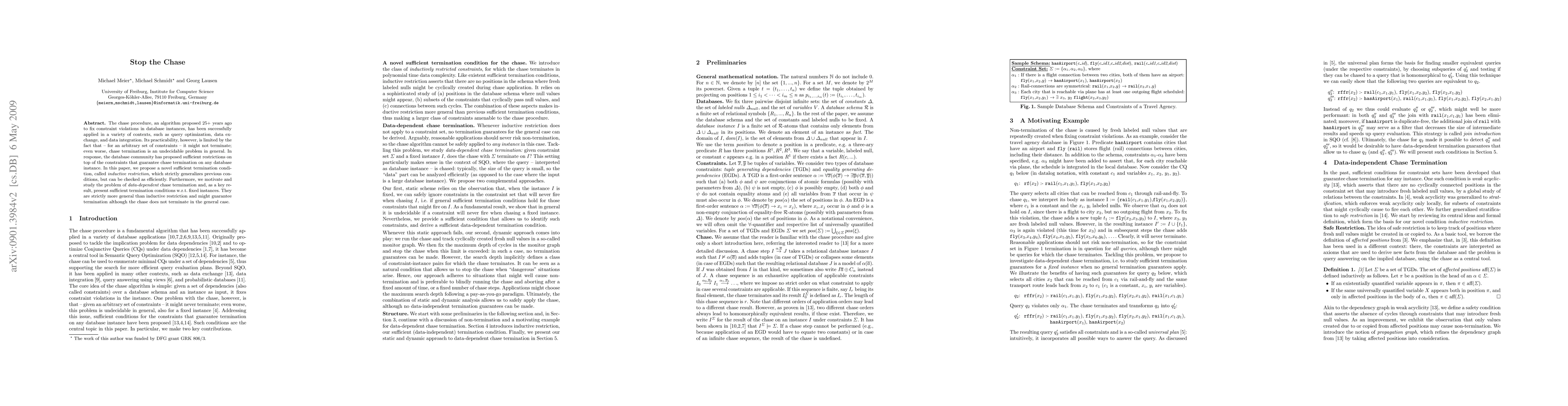 The chase procedure, an algorithm proposed 25+ years ago to fix constraint violations in database instances, has been successfully applied in a variety of contexts, such as query optimization, data exchange, and data integration. Its practicability, however, is limited by the fact that - for an arbitrary set of constraints - it might not terminate; even worse, chase termination is an undecidable problem in general. In response, the database community has proposed sufficient restrictions on top of the constraints that guarantee chase termination on any database instance. In this paper, we propose a novel sufficient termination condition, called inductive restriction, which strictly generalizes previous conditions, but can be checked as efficiently. Furthermore, we motivate and study the problem of data-dependent chase termination and, as a key result, present sufficient termination conditions w.r.t. fixed instances. They are strictly more general than inductive restriction and might guarantee termination although the chase does not terminate in the general case.
