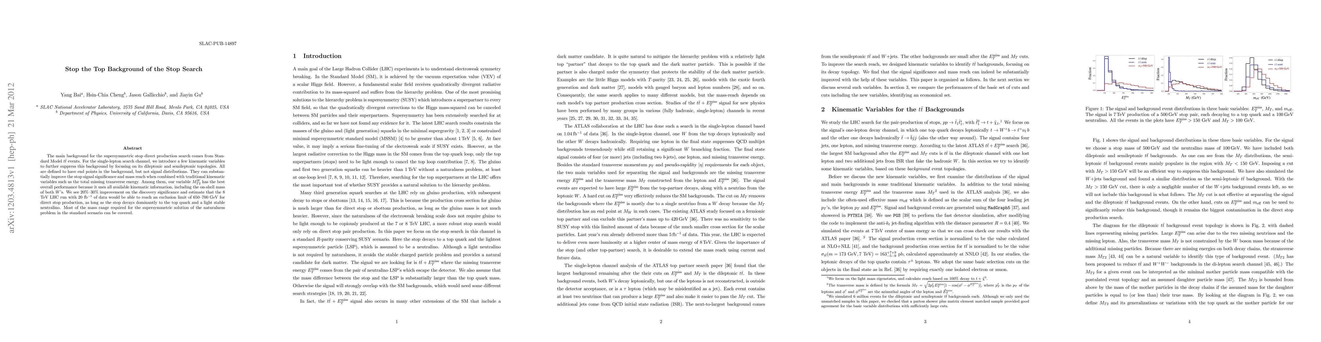The main background for the supersymmetric stop direct production search comes from Standard Model ttbar events. For the single-lepton search channel, we introduce a few kinematic variables to further suppress this background by focusing on its dileptonic and semileptonic topologies. All are defined to have end points in the background, but not signal distributions. They can substantially improve the stop signal significance and mass reach when combined with traditional kinematic variables such as the total missing transverse energy. Among them, our variable M^W_T2 has the best overall performance because it uses all available kinematic information, including the on-shell mass of both W's. We see 20%-30% improvement on the discovery significance and estimate that the 8 TeV LHC run with 20 fb-1 of data would be able to reach an exclusion limit of 650-700 GeV for direct stop production, as long as the stop decays dominantly to the top quark and a light stable neutralino. Most of the mass range required for the supersymmetric solution of the naturalness problem in the standard scenario can be covered.