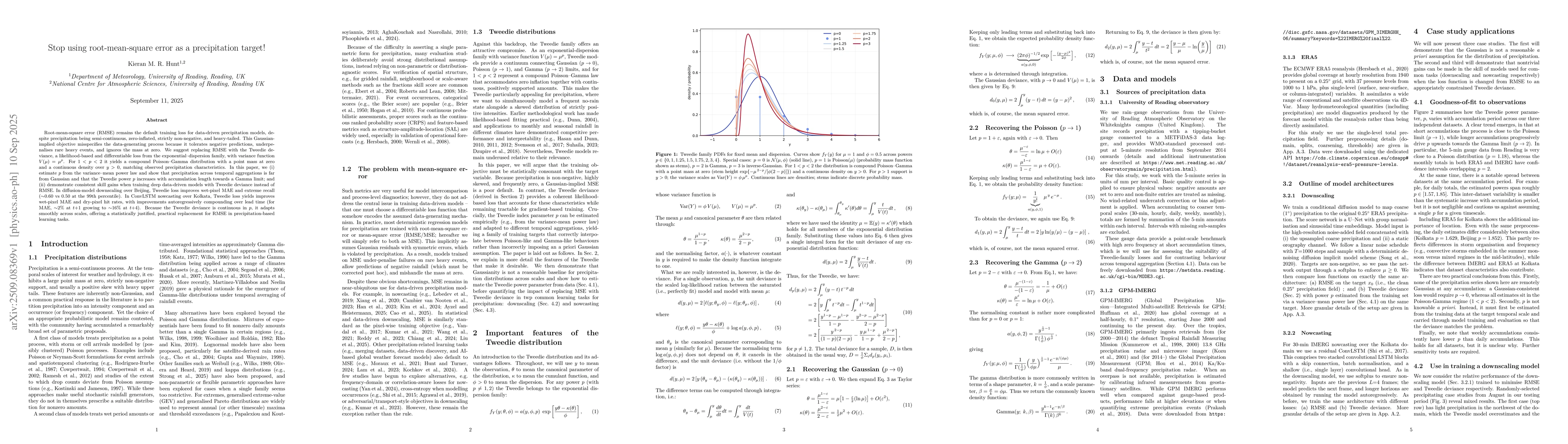 Root-mean-square error (RMSE) remains the default training loss for data-driven precipitation models, despite precipitation being semi-continuous, zero-inflated, strictly non-negative, and heavy-tailed. This Gaussian-implied objective misspecifies the data-generating process because it tolerates negative predictions, underpenalises rare heavy events, and ignores the mass at zero. We propose replacing RMSE with the Tweedie deviance, a likelihood-based and differentiable loss from the exponential--dispersion family with variance function $V(\mu)=\mu^p$. For $1
