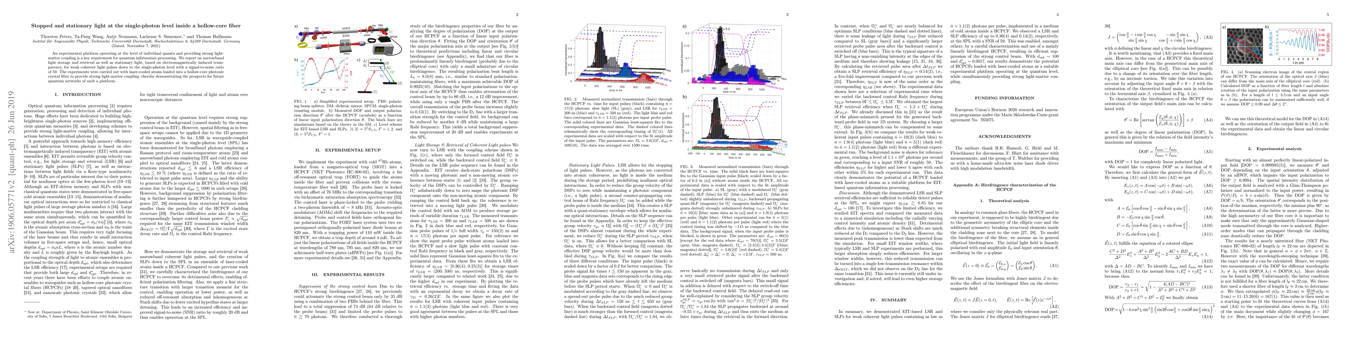 An experimental platform operating at the level of individual quanta and providing strong light-matter coupling is a key requirement for quantum information processing. We report on narrowband light storage and retrieval as well as stationary light, based on electromagnetically induced transparency, for weak coherent light pulses down to the single-photon level with a signal-to-noise ratio of 59. The experiments were carried out with laser-cooled atoms loaded into a hollow-core photonic crystal fiber to provide strong light-matter coupling, thereby demonstrating the prospects for future quantum networks of such a platform.