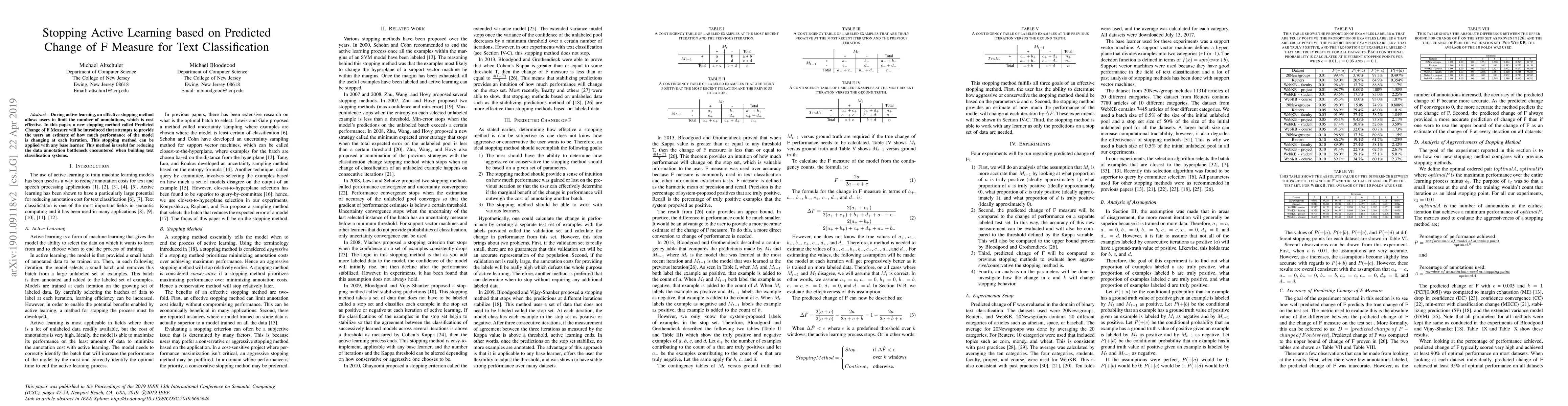 This paper introduces a new stopping method called Predicted Change of F Measure for active learning in text classification, aiming to estimate the performance change at each iteration to limit annotation costs. This method is applicable to any base learner and helps reduce the data annotation bottleneck.