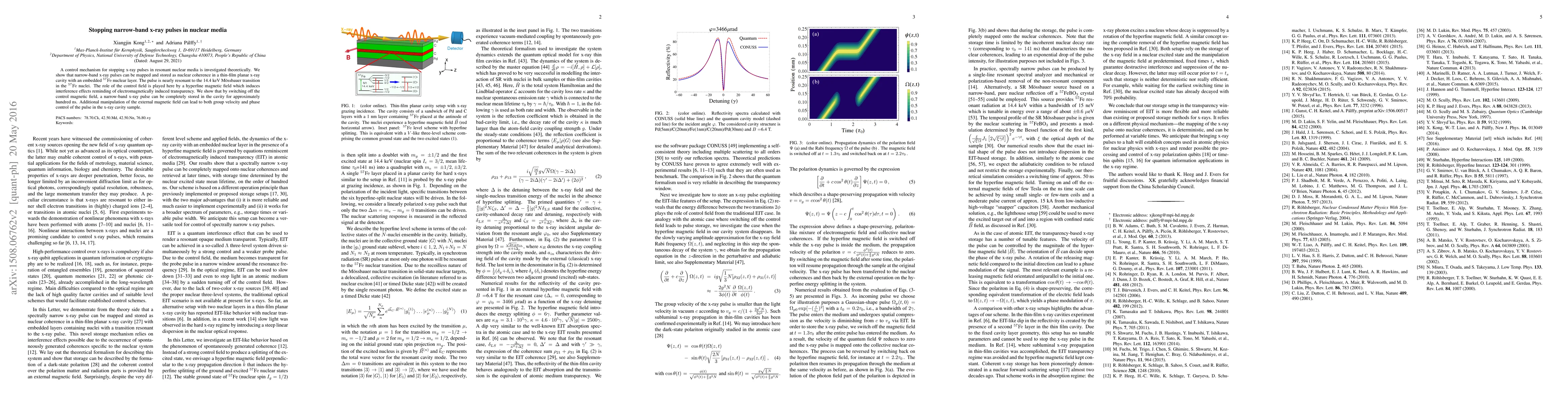 A control mechanism for stopping x-ray pulses in resonant nuclear media is investigated theoretically. We show that narrow-band x-ray pulses can be mapped and stored as nuclear coherence in a thin-film planar x-ray cavity with an embedded $^{57}\mathrm{Fe}$ nuclear layer. The pulse is nearly resonant to the 14.4 keV M\"ossbauer transition in the $^{57}\mathrm{Fe}$ nuclei. The role of the control field is played here by a hyperfine magnetic field which induces interference effects reminding of electromagnetically induced transparency. We show that by switching off the control magnetic field, a narrow-band x-ray pulse can be completely stored in the cavity for approximately 100 ns. Additional manipulation of the external magnetic field can lead to both group velocity and phase control of the pulse in the x-ray cavity sample.