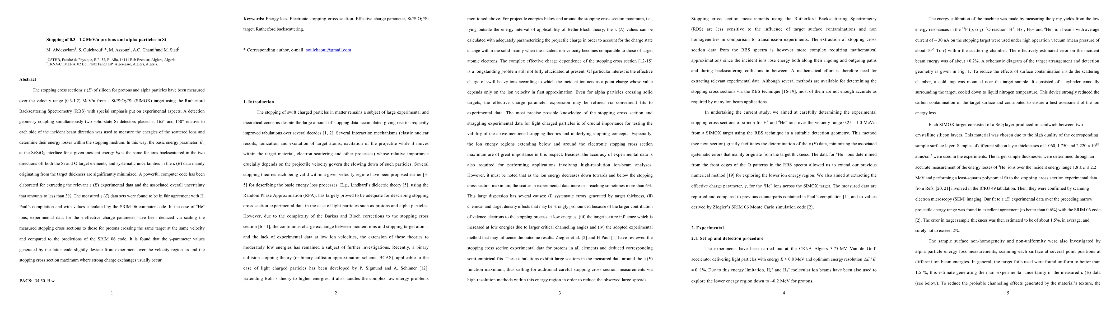 The stopping cross sections S (E) of silicon for protons and alpha particles have been measured over the velocity range 0.3-1.2 MeV/u from a SIMOX target using the Rutherford Backscattering Spectrometry (RBS) with special emphasis put on experimental aspects. A detection geometry coupling simultaneously two solid-state Si detectors placed at 165 degrees and 150 degrees relative to each side of the incident beam direction was used to measure the energies of the scattered ions and determine their energy losses within the stopping medium. In this way, the basic energy parameter, Ex, at the Si-SiO2 interface for a given incident energy E0 is the same for ions backscattered in the two directions off both the Si and O target elements, and systematic uncertainties in the S (E) data mainly originating from the target thickness are significantly minimized. A powerful computer code has been elaborated for extracting the relevant S (E) experimental data and the associated overall uncertainty that amounts to less than 3%. The measured S (E) data sets were found to be in fair agreement with H. Paul compilation and with values calculated by the SRIM 06 computer code. In the case of 4He+ ions, experimental data for the gamma-effective charge parameter have been deduced via scaling the measured stopping cross sections to those for protons crossing the same target at the same velocity and compared to the predictions of the SRIM 06 code. It is found that the gamma-parameter values generated by the latter code slightly deviate from experiment over the velocity region around the stopping cross section maximum where strong charge exchanges usually occur.