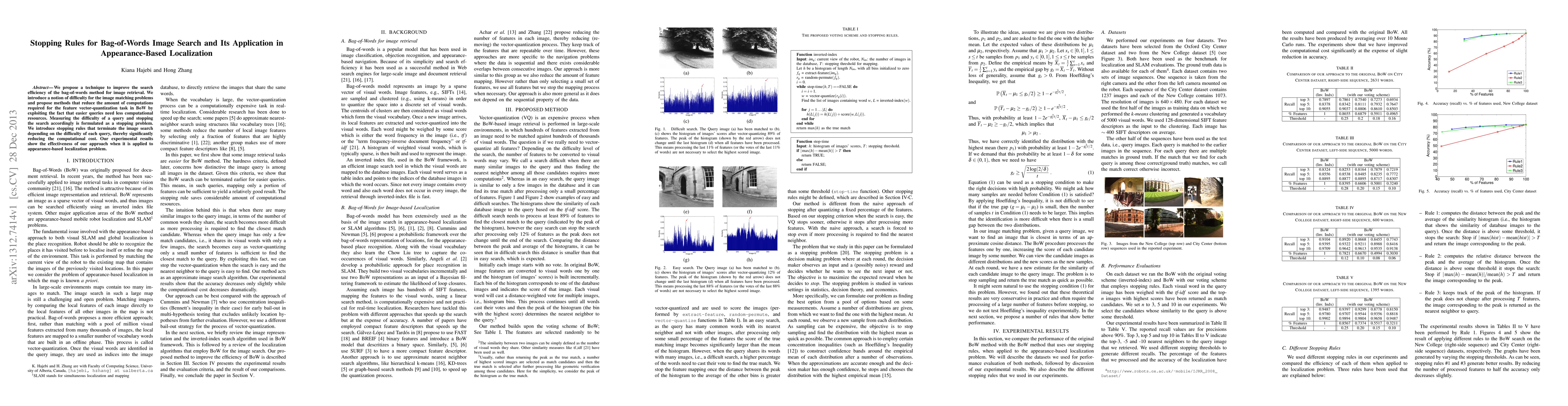 We propose a technique to improve the search efficiency of the bag-of-words (BoW) method for image retrieval. We introduce a notion of difficulty for the image matching problems and propose methods that reduce the amount of computations required for the feature vector-quantization task in BoW by exploiting the fact that easier queries need less computational resources. Measuring the difficulty of a query and stopping the search accordingly is formulated as a stopping problem. We introduce stopping rules that terminate the image search depending on the difficulty of each query, thereby significantly reducing the computational cost. Our experimental results show the effectiveness of our approach when it is applied to appearance-based localization problem.