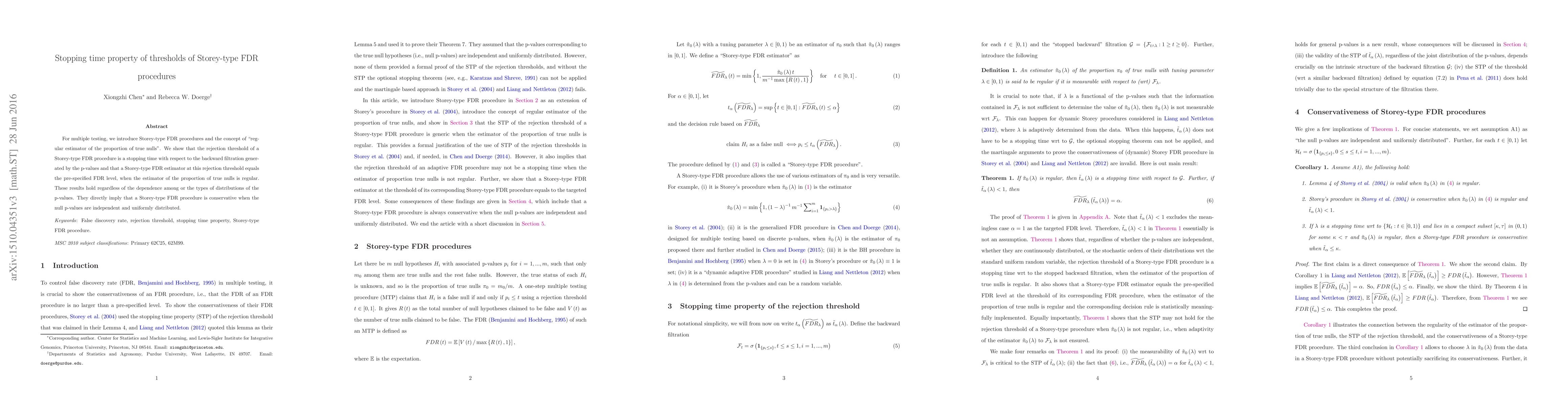 For multiple testing, we introduce Storey-type FDR procedures and the concept of "regular estimator of the proportion of true nulls". We show that the rejection threshold of a Storey-type FDR procedure is a stopping time with respect to the backward filtration generated by the p-values and that a Storey-type FDR estimator at this rejection threshold equals the pre-specified FDR level, when the estimator of the proportion of true nulls is regular. These results hold regardless of the dependence among or the types of distributions of the p-values. They directly imply that a Storey-type FDR procedure is conservative when the null p-values are independent and uniformly distributed.