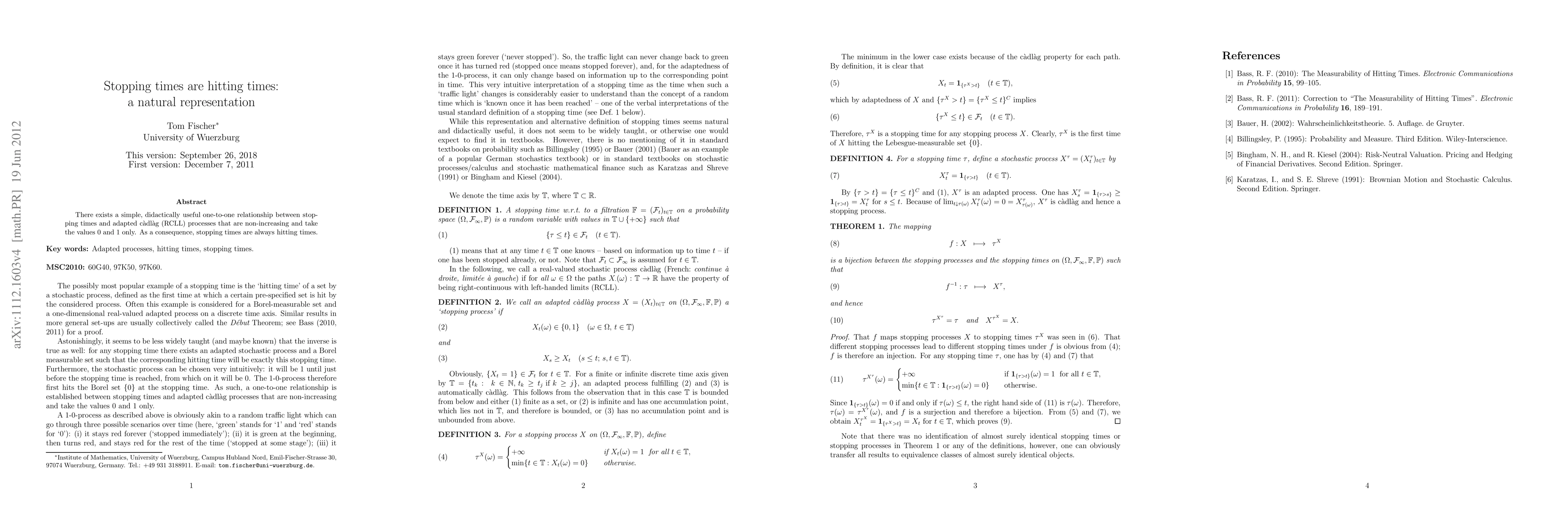 The paper establishes a one-to-one relationship between stopping times and adapted càdlàg processes that are non-increasing and take values 0 and 1 only, demonstrating that stopping times are always hitting times.