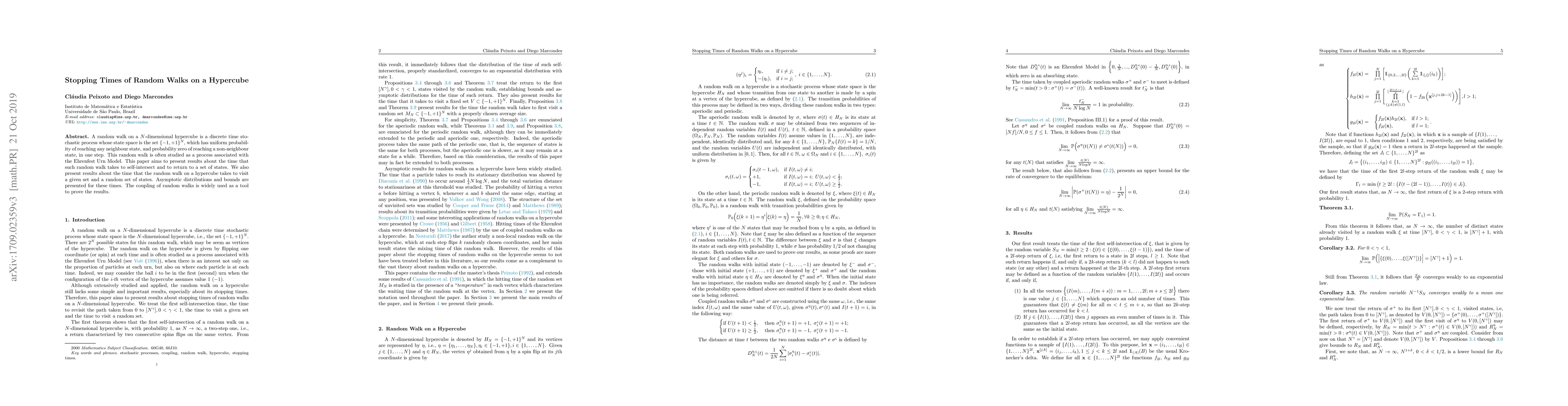A study on random walks on hypercubes reveals the time it takes for these walks to self-intersect, return to a set of states, visit a given set, and explore a random set of states, with asymptotic distributions and bounds presented.