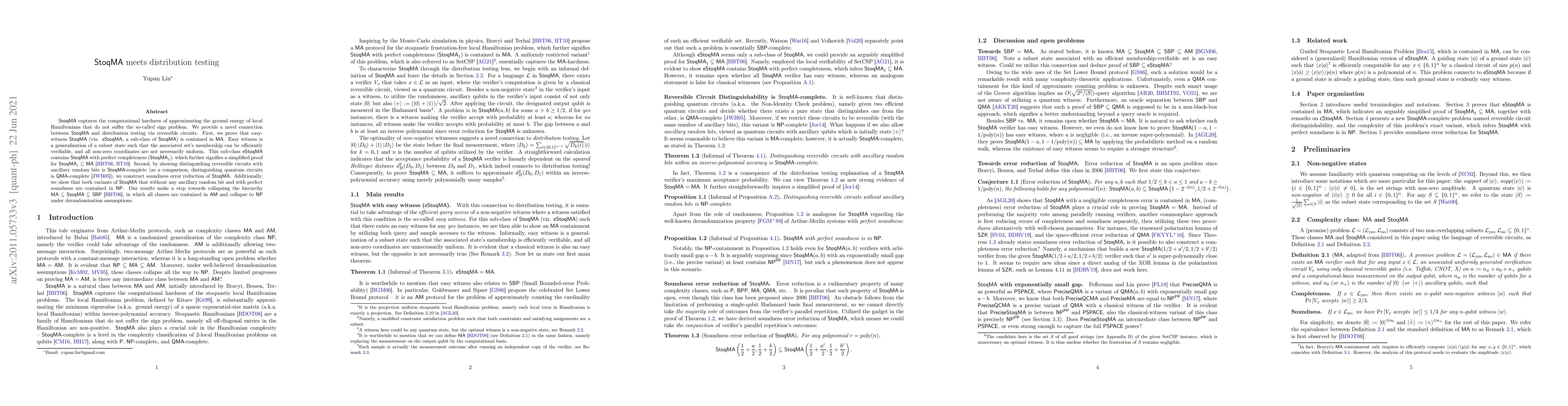 $\mathsf{StoqMA}$ captures the computational hardness of approximating the ground energy of local Hamiltonians that do not suffer the so-called sign problem. We provide a novel connection between $\mathsf{StoqMA}$ and distribution testing via reversible circuits. First, we prove that easy-witness $\mathsf{StoqMA}$ (viz. $\mathsf{eStoqMA}$, a sub-class of $\mathsf{StoqMA}$) is contained in $\mathsf{MA}$. Easy witness is a generalization of a subset state such that the associated set's membership can be efficiently verifiable, and all non-zero coordinates are not necessarily uniform. This sub-class $\mathsf{eStoqMA}$ contains $\mathsf{StoqMA}$ with perfect completeness ($\mathsf{StoqMA}_1$), which further signifies a simplified proof for $\mathsf{StoqMA}_1 \subseteq \mathsf{MA}$ [BBT06, BT10]. Second, by showing distinguishing reversible circuits with ancillary random bits is $\mathsf{StoqMA}$-complete (as a comparison, distinguishing quantum circuits is $\mathsf{QMA}$-complete [JWB05]), we construct soundness error reduction of $\mathsf{StoqMA}$. Additionally, we show that both variants of $\mathsf{StoqMA}$ that without any ancillary random bit and with perfect soundness are contained in $\mathsf{NP}$. Our results make a step towards collapsing the hierarchy $\mathsf{MA} \subseteq \mathsf{StoqMA} \subseteq \mathsf{SBP}$ [BBT06], in which all classes are contained in $\mathsf{AM}$ and collapse to $\mathsf{NP}$ under derandomization assumptions.