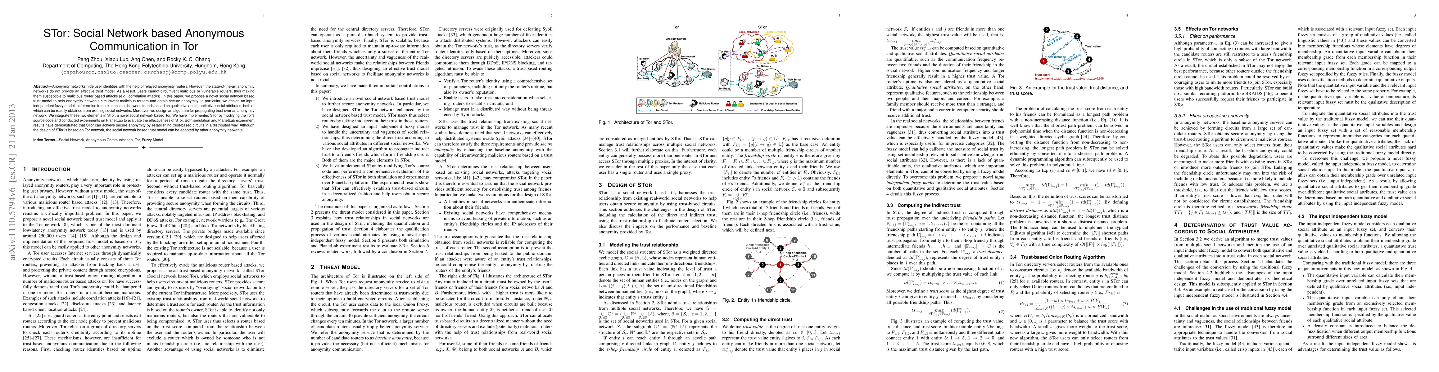 This paper proposes STor, a social network-based trust model for the Tor anonymity network, to help users avoid malicious routers. It introduces a fuzzy trust model using social attributes and an algorithm for trust propagation, demonstrating effective secure anonymity through experiments on PlanetLab.