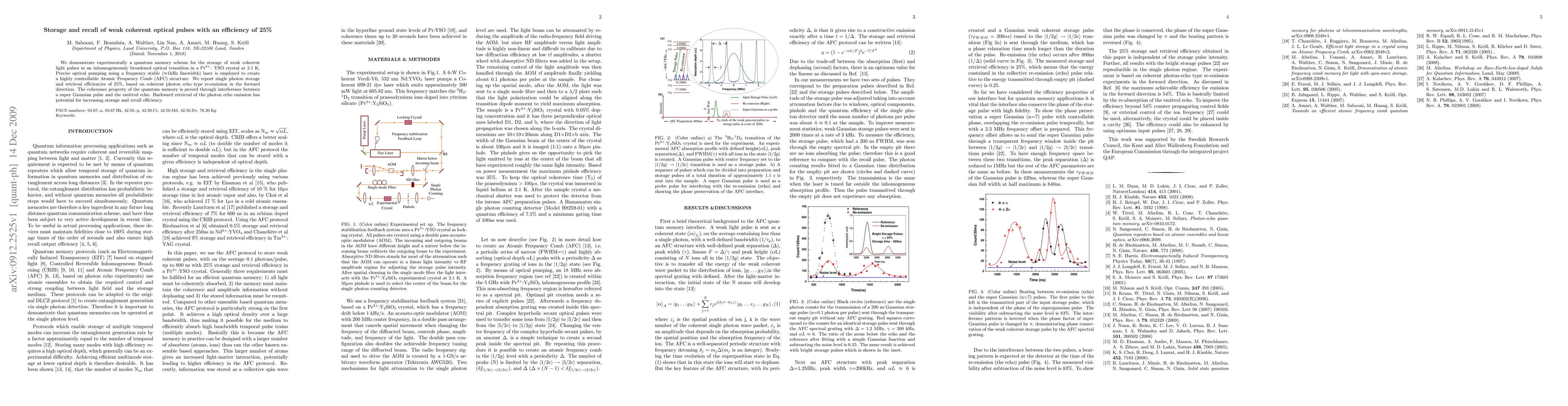 We demonstrate experimentally a quantum memory scheme for the storage of weak coherent light pulses in an inhomogeneously broadened optical transition in a Pr^{3+}: YSO crystal at 2.1 K. Precise optical pumping using a frequency stable (about 1kHz linewidth) laser is employed to create a highly controllable Atomic Frequency Comb (AFC) structure. We report single photon storage and retrieval efficiencies of 25%, based on coherent photon echo type re-emission in the forward direction. The coherence property of the quantum memory is proved through interference between a super Gaussian pulse and the emitted echo. Backward retrieval of the photon echo emission has potential for increasing storage and recall efficiency.