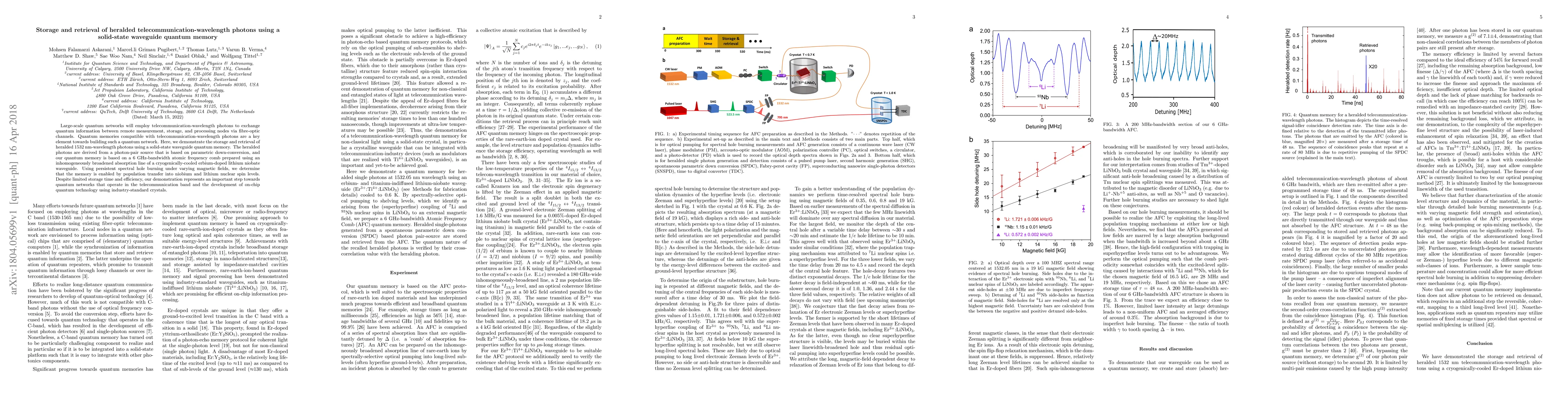 This paper demonstrates the storage and retrieval of 1532 nm-wavelength heralded photons using a solid-state waveguide quantum memory based on erbium-doped lithium niobate, marking progress towards scalable quantum networks operating at telecommunication wavelengths. The memory employs persistent spectral hole burning and reveals population transfer into niobium and lithium nuclear spin levels.