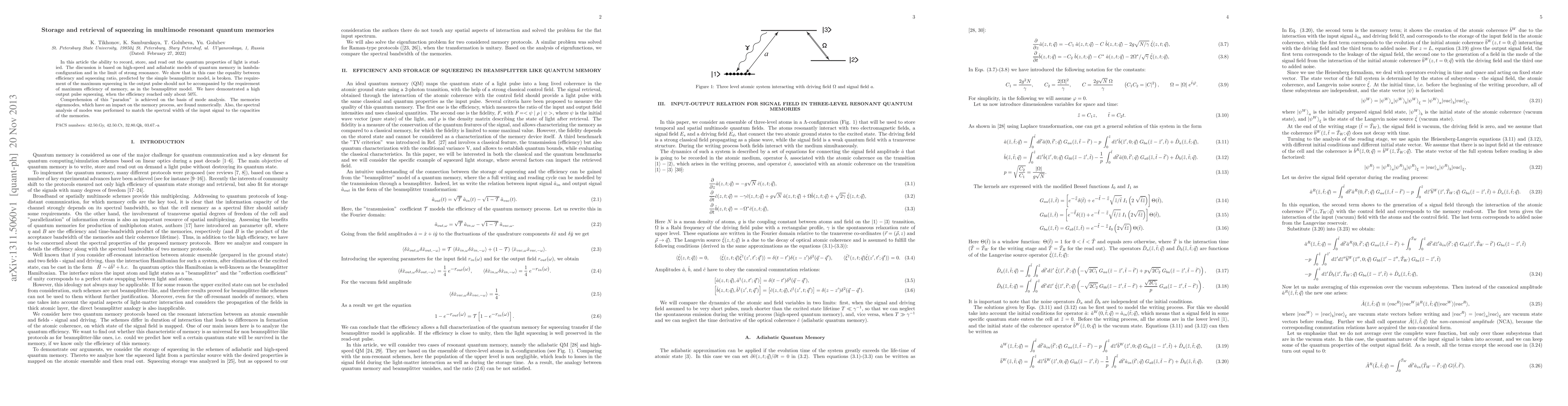 In this article the ability to record, store, and read out the quantum properties of light is studied. The discussion is based on high-speed and adiabatic models of quantum memory in lambda-configuration and in the limit of strong resonance. We show that in this case the equality between efficiency and squeezing ratio, predicted by the simple beamsplitter model, is broken. The requirement of the maximum squeezing in the output pulse should not be accompanied by the requirement of maximum efficiency of memory, as in the beamsplitter model. We have demonstrated a high output pulse squeezing, when the efficiency reached only about 50%. Comprehension of this "paradox" is achieved on the basis of mode analysis. The memories eigenmodes, which have an impact on the memory process, are found numerically. Also, the spectral analysis of modes was performed to match the spectral width of the input signal to the capacities of the memories.