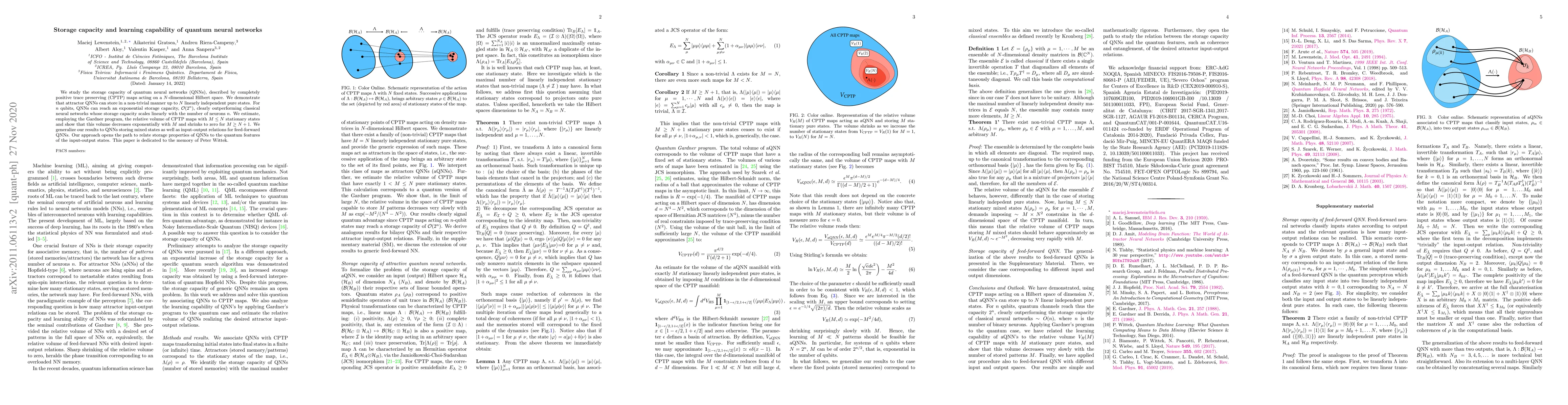 This paper investigates the storage capacity of quantum neural networks (QNNs) and demonstrates that they can store an exponential number of linearly independent states compared to classical networks. The study also explores the structure of these storage maps and the relative volume of maps with multiple stationary states, showing an exponential decrease beyond the network's dimensional capacity.