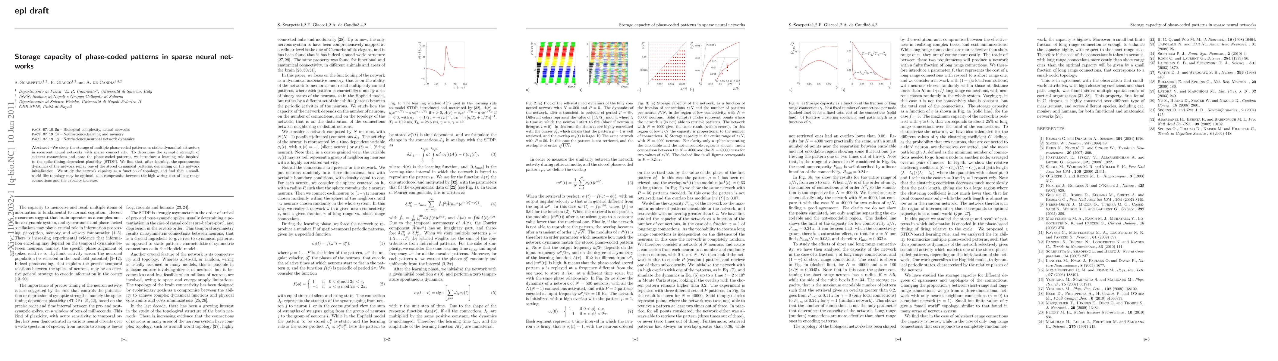 This study explores how sparse recurrent neural networks can store multiple phase-coded patterns using a learning rule based on spike-timing dependent plasticity. It finds that a small-world topology may optimize storage capacity by balancing wiring costs and capacity gains.