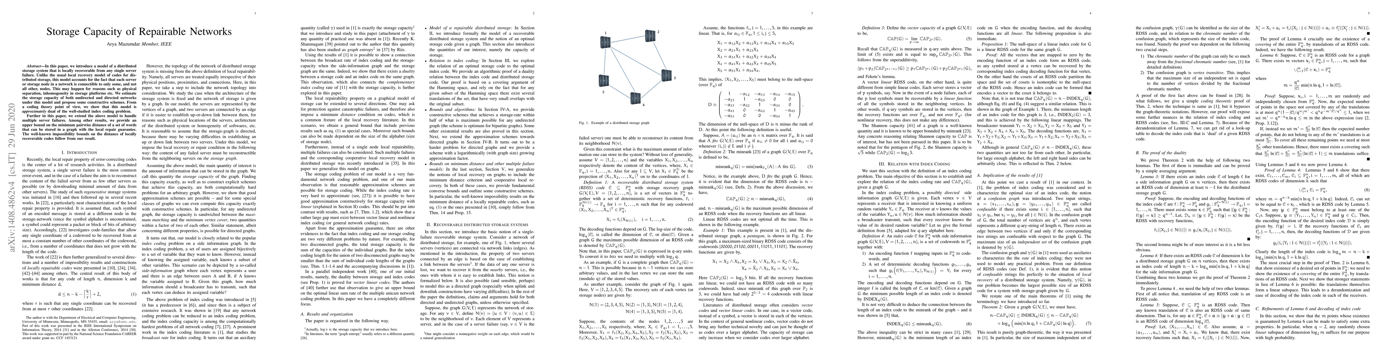 In this paper, we introduce a model of a distributed storage system that is locally recoverable from any single server failure. Unlike the usual local recovery model of codes for distributed storage, this model accounts for the fact that each server or storage node in a network is connectible to only some, and not all other, nodes. This may happen for reasons such as physical separation, inhomogeneity in storage platforms etc. We estimate the storage capacity of both undirected and directed networks under this model and propose some constructive schemes. From a coding theory point of view, we show that this model is approximately dual of the well-studied index coding problem. Further in this paper, we extend the above model to handle multiple server failures. Among other results, we provide an upper bound on the minimum pairwise distance of a set of words that can be stored in a graph with the local repair guarantee. The well-known impossibility bounds on the distance of locally recoverable codes follow from our result.