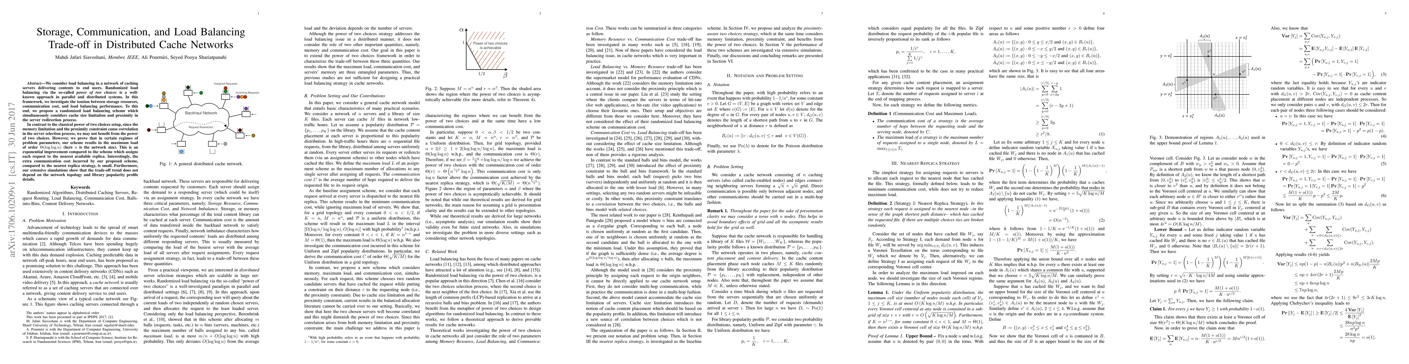 This paper proposes a randomized load balancing scheme for distributed cache networks that considers cache size limitations and server proximity, demonstrating exponential improvement in load balancing performance compared to the nearest replica strategy, with minimal extra communication cost. Simulation results show consistent trade-off trends across different network topologies and popularity profiles.