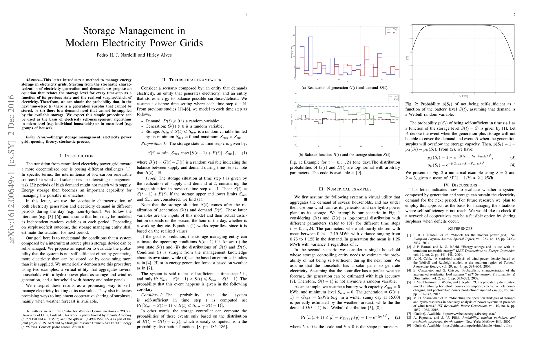 This paper proposes a method for managing energy storage in electricity grids by relating storage levels to stochastic generation and demand patterns, aiming to predict surpluses and deficits. The approach can form the basis for self-management algorithms at both household and community levels.
