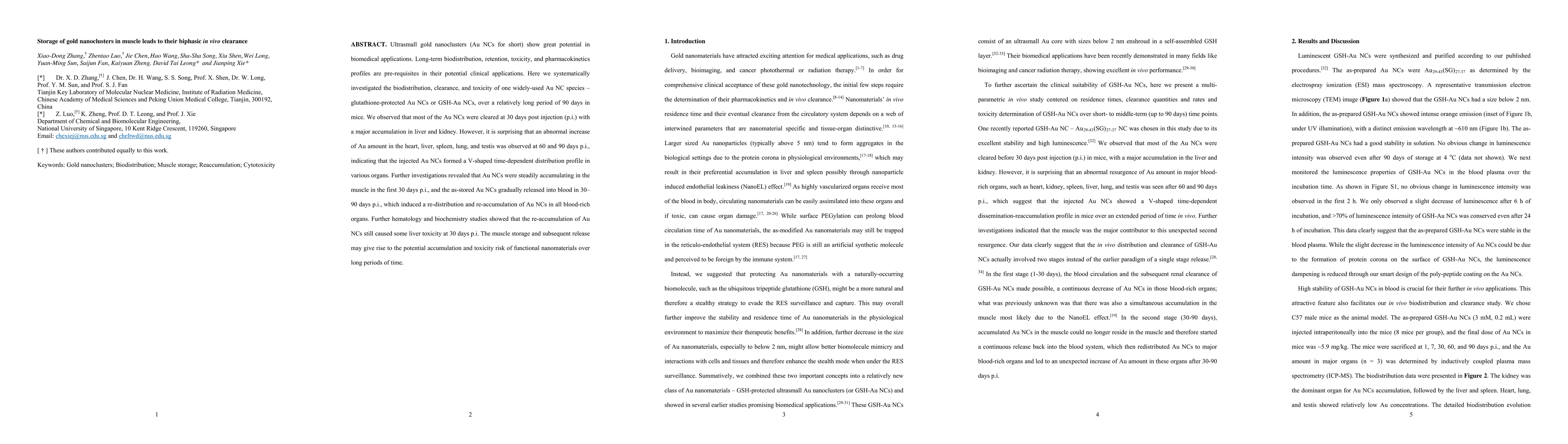 This study investigated the long-term biodistribution and clearance of glutathione-protected gold nanoclusters (GSH Au NCs) in mice over 90 days, revealing biphasic clearance patterns and unexpected reaccumulation in various organs, including the heart, liver, spleen, lung, and testis, due to their initial storage and subsequent release from muscle tissue, posing potential long-term toxicity risks.