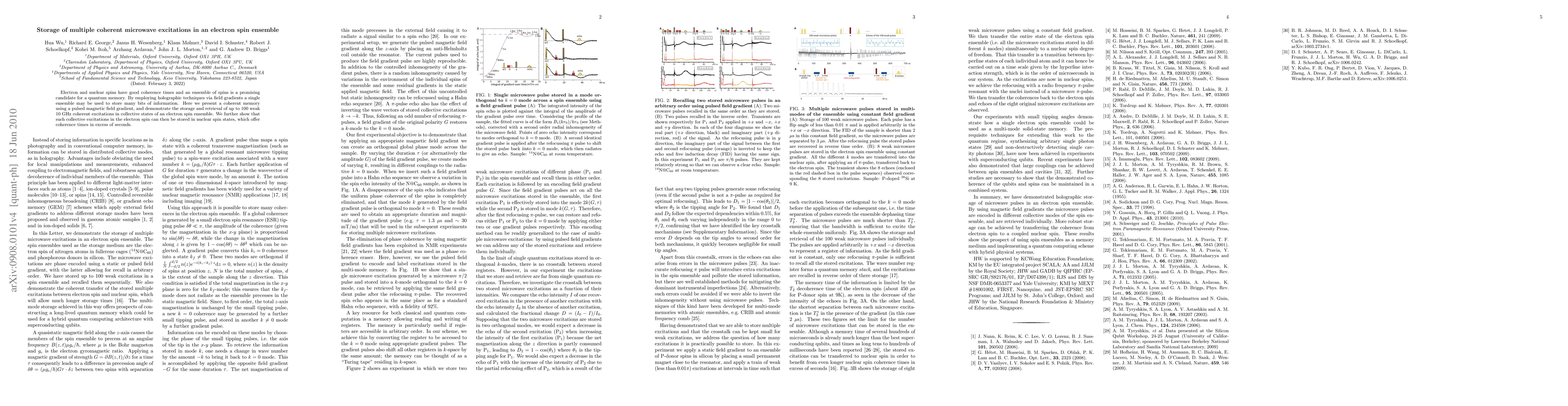 The research demonstrates a method using pulsed magnetic field gradients to store up to 100 microwave excitations in an electron spin ensemble, with each excitation at 10 GHz. These excitations can then be transferred to nuclear spins for extended coherence times exceeding seconds, showcasing potential for quantum memory applications.
