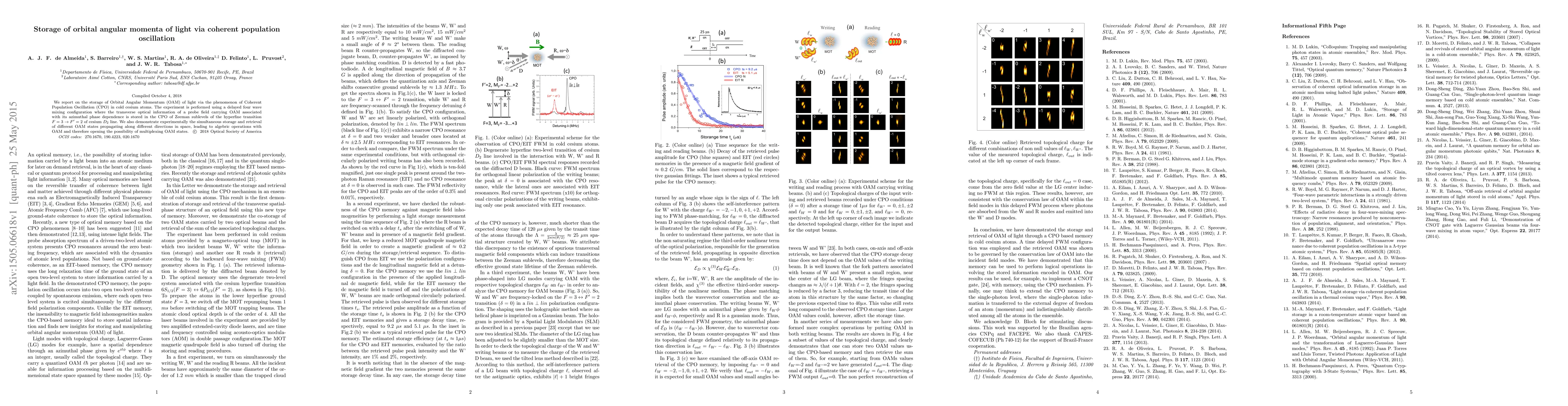 This paper details the storage of Orbital Angular Momentum (OAM) of light using Coherent Population Oscillation in cold cesium atoms, achieved via a delayed four wave mixing configuration. The experiment demonstrates the simultaneous storage and retrieval of different OAM states, enabling algebraic operations and potential for OAM multiplexing.