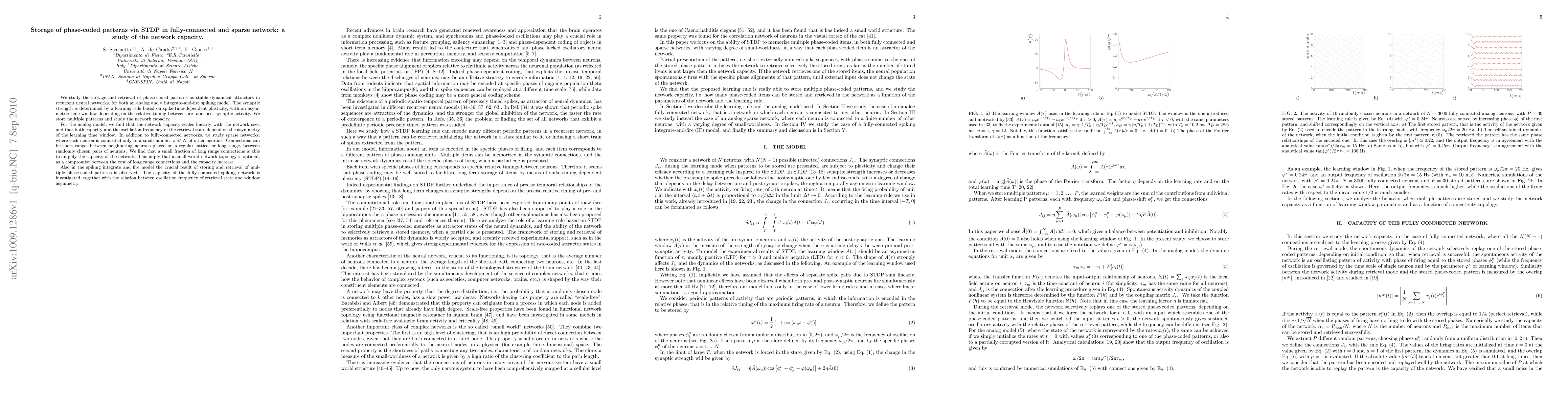 This paper investigates the storage and retrieval of phase-coded patterns in recurrent neural networks using spike-time-dependent plasticity (STDP). It finds that both fully-connected and sparse networks can store multiple patterns, with optimal capacity achieved through a small-world topology in sparse networks.