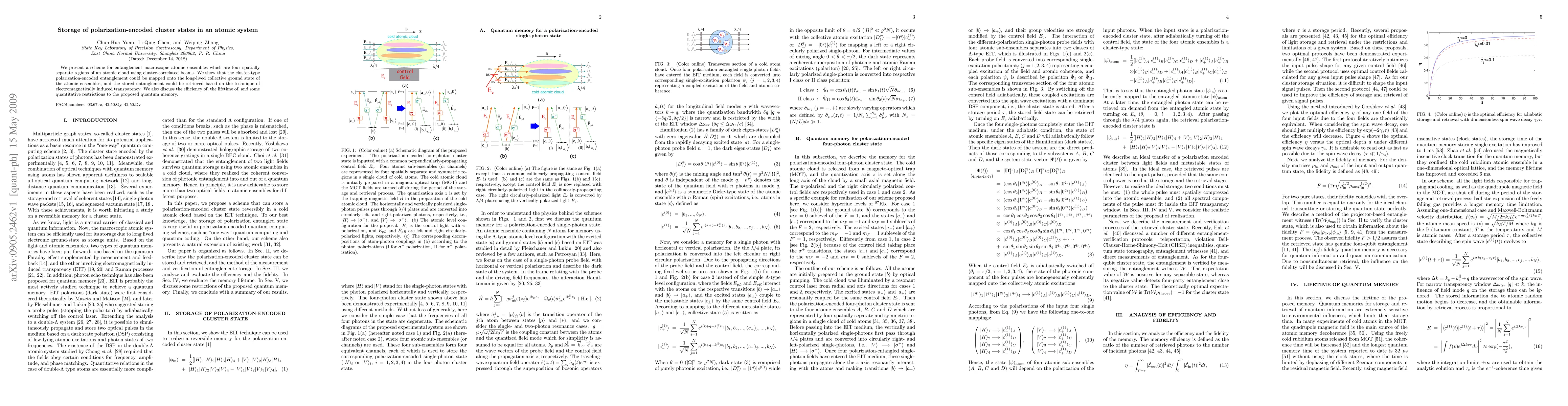 This paper proposes a method to store polarization-encoded cluster states in macroscopic atomic ensembles using cluster-correlated beams, utilizing electromagnetically induced transparency for retrieval. The study evaluates the efficiency, lifetime, and quantitative limitations of the proposed quantum memory system.