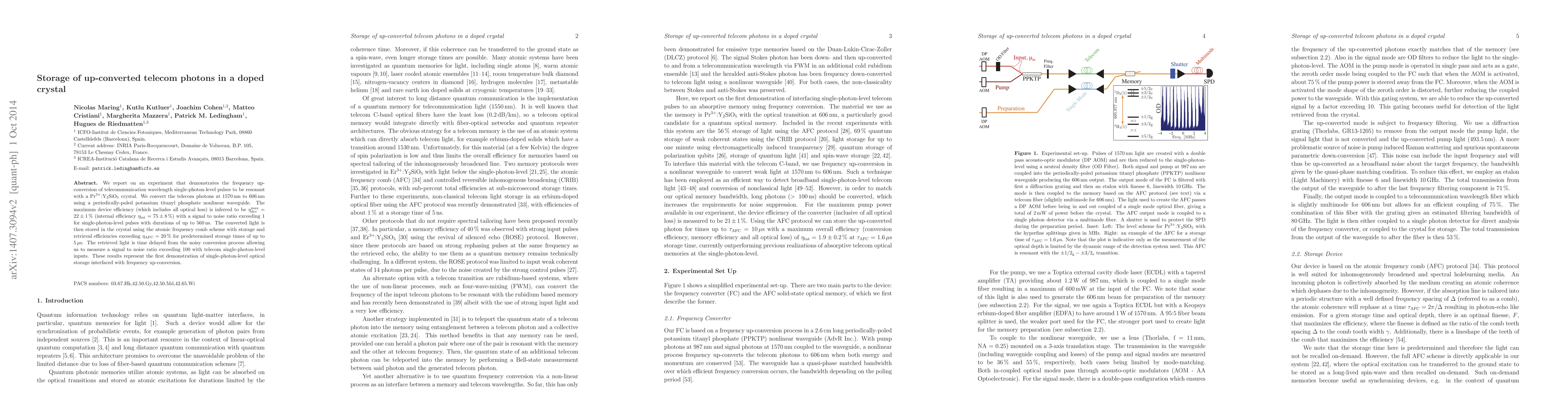 This paper demonstrates the up-conversion of telecom photons to a visible wavelength using a nonlinear waveguide, followed by storage in a $\mathrm{Pr}^{3+}$:$\mathrm{Y}_2\mathrm{Si}\mathrm{O}_5$ crystal, achieving high storage efficiency and signal-to-noise ratio, marking a significant step in single-photon optical storage technology.