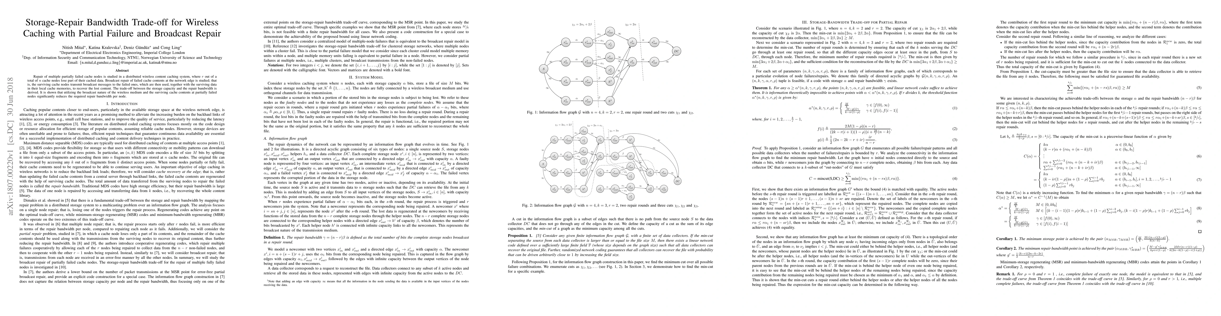This paper investigates the repair of partially failed cache nodes in a wireless caching system, deriving the trade-off between storage capacity and repair bandwidth. It demonstrates that broadcast repair leverages surviving cache contents to significantly reduce the repair bandwidth needed.