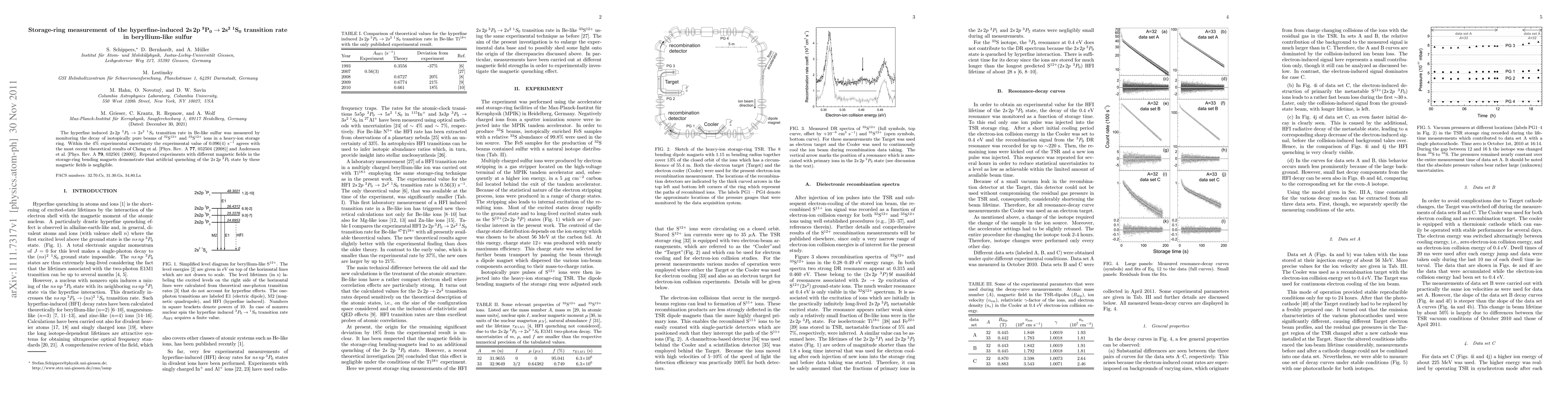The paper reports a storage-ring measurement of the hyperfine-induced transition rate in Be-like sulfur, finding 0.096(4)/s, consistent with recent theoretical results. The study confirms negligible artificial quenching of the 2s 2p 3P0 state by magnetic fields in the storage ring.