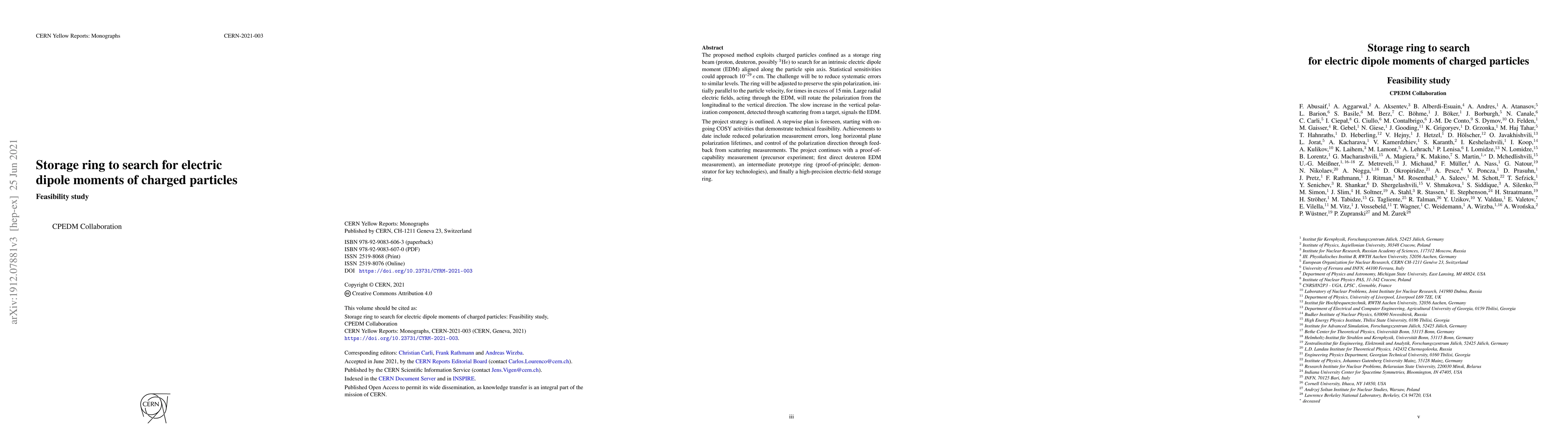 The proposed method exploits charged particles confined as a storage ring beam (proton, deuteron, possibly $^3$He) to search for an intrinsic electric dipole moment (EDM) aligned along the particle spin axis. Statistical sensitivities could approach 10$^{-29}$ e$\cdot$cm. The challenge will be to reduce systematic errors to similar levels. The ring will be adjusted to preserve the spin polarisation, initially parallel to the particle velocity, for times in excess of 15 minutes. Large radial electric fields, acting through the EDM, will rotate the polarisation from the longitudinal to the vertical direction. The slow rise in the vertical polarisation component, detected through scattering from a target, signals the EDM. The project strategy is outlined. A stepwise plan is foreseen, starting with ongoing COSY activities that demonstrate technical feasibility. Achievements to date include reduced polarization measurement errors, long horizontal plane polarization lifetimes, and control of the polarization direction through feedback from scattering measurements. The project continues with a proof-of-capability measurement (precursor experiment; first direct deuteron EDM measurement), an intermediate prototype ring (proof-of-principle; demonstrator for key technologies), and finally a high-precision electric-field storage ring.