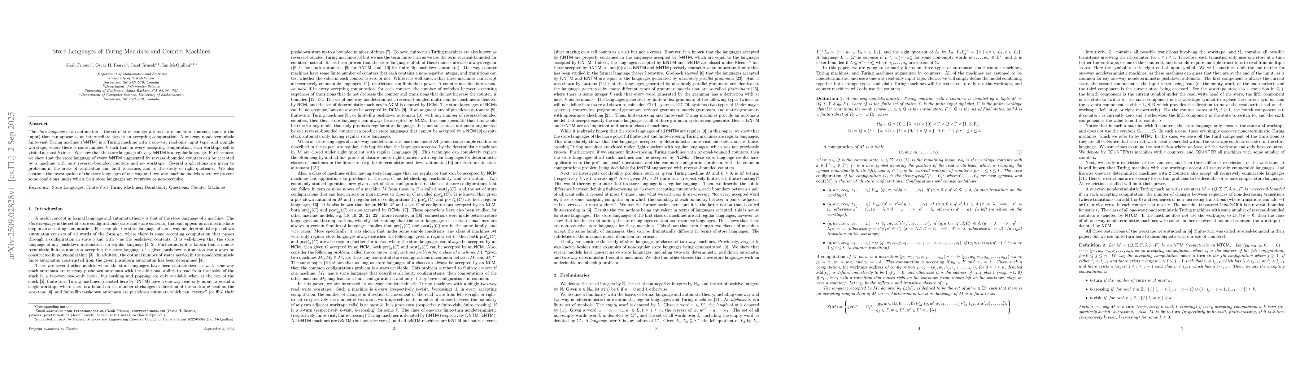 The store language of an automaton is the set of store configurations (state and store contents, but not the input) that can appear as an intermediate step in an accepting computation. A one-way nondeterministic finite-visit Turing machine (fvNTM) is a Turing machine with a one-way read-only input tape, and a single worktape, where there is some number $k$ such that in every accepting computation, each worktape cell is visited at most $k$ times. We show that the store language of every fvNTM is a regular language. Furthermore, we show that the store language of every fvNTM augmented by reversal-bounded counters can be accepted by a machine with only reversal-bounded counters and no worktape. Several applications are given to problems in the areas of verification and fault tolerance, and to the study of right quotients. We also continue the investigation of the store languages of one-way and two-way machine models where we present some conditions under which their store languages are recursive or non-recursive.