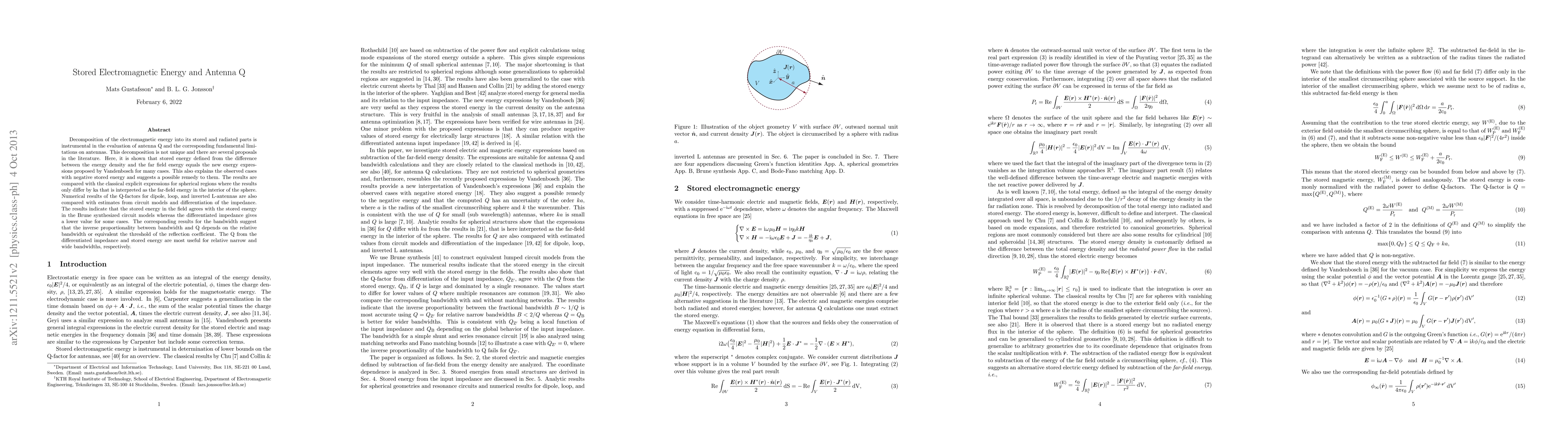 This paper explores the decomposition of electromagnetic energy into stored and radiated parts to evaluate antenna Q, showing equivalence between different energy expressions and addressing negative stored energy cases. It finds that the stored energy aligns with Brune synthesized circuit models but differs from differentiated impedance estimates, with implications for bandwidth and Q relationships.