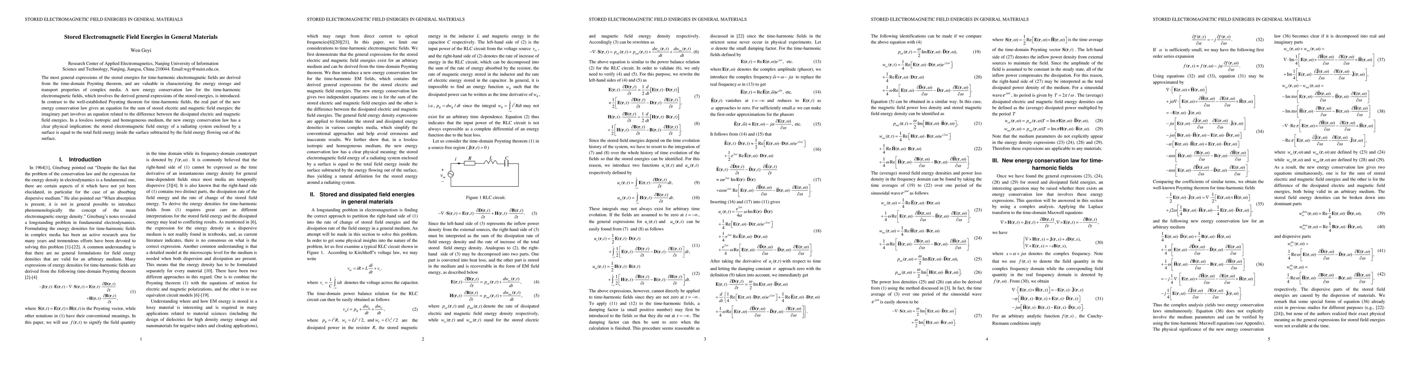 This paper derives general expressions for stored electromagnetic field energies from the time-domain Poynting theorem, introducing a new energy conservation law that characterizes energy storage and transport in complex media. The new law provides insights into the sum of stored electric and magnetic energies and the difference between dissipated energies, with a clear physical implication in lossless media.