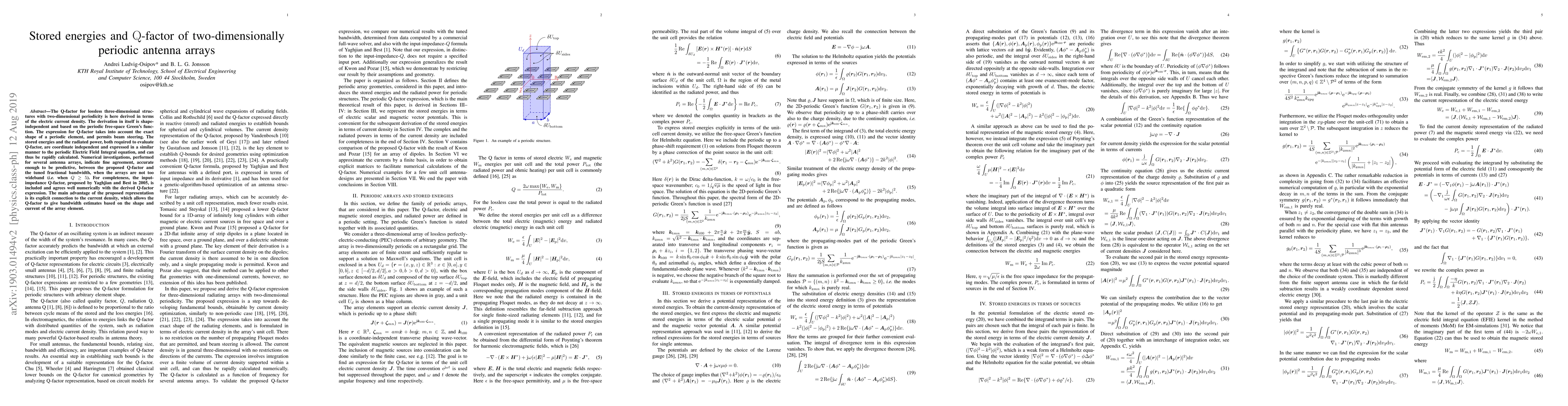 The Q-factor for lossless three-dimensional structures with two-dimensional periodicity is derived in terms of the electric current density.