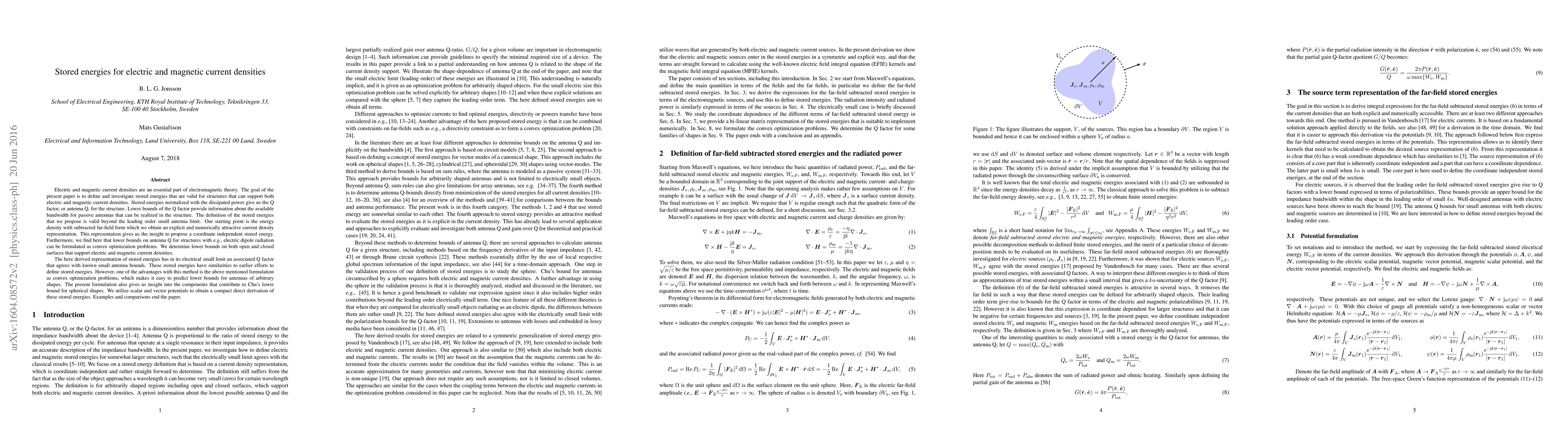 This paper defines and investigates stored energies for structures supporting both electric and magnetic current densities, proposing a coordinate-independent stored energy definition. It also formulates lower bounds on antenna Q as convex optimization problems, providing insights into bandwidth and Chu's lower bound for spherical shapes.