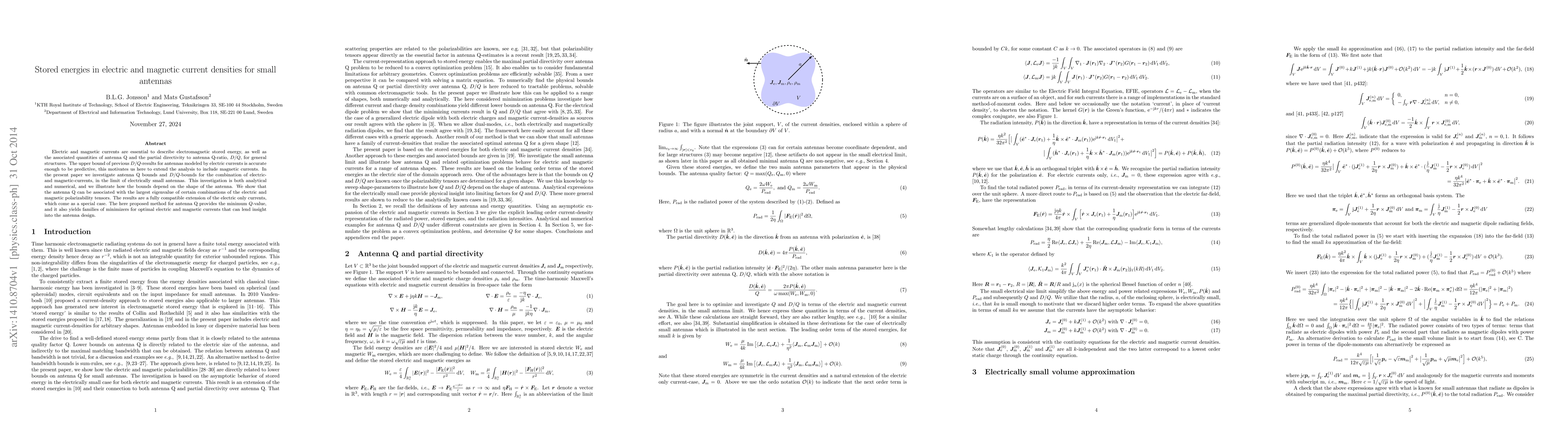This paper investigates the stored energies in electric and magnetic current densities for small antennas, providing analytical and numerical bounds for antenna Q and D/Q ratios. It extends previous results to include magnetic currents, showing that antenna Q relates to the largest eigenvalue of electric and magnetic polarizability tensors.