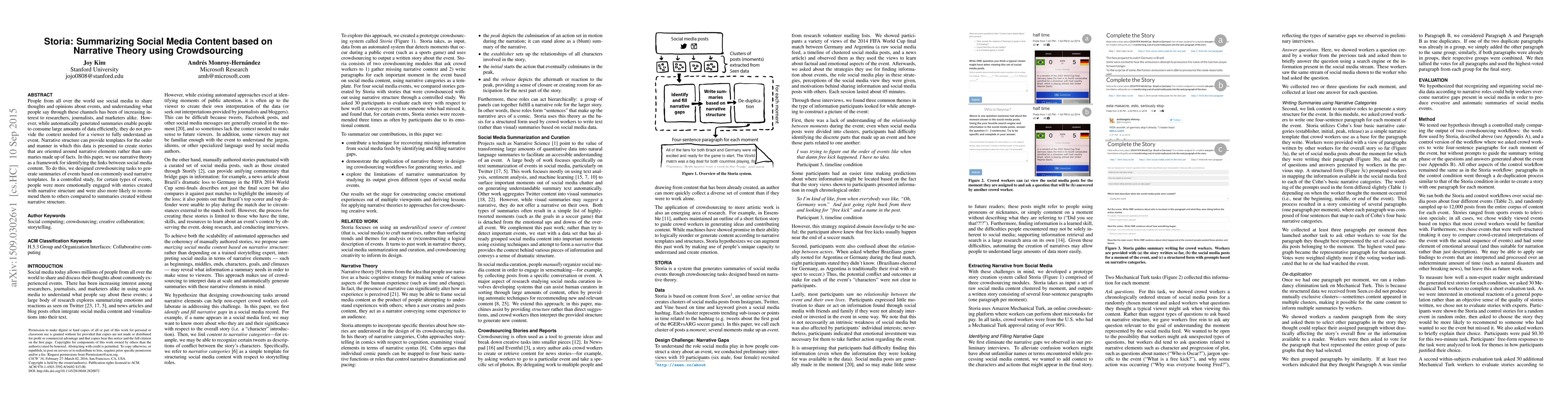 This paper explores using narrative theory to create emotionally engaging summaries of social media content through crowdsourcing, finding that narratives enhance emotional engagement and recommendation likelihood compared to fact-based summaries.