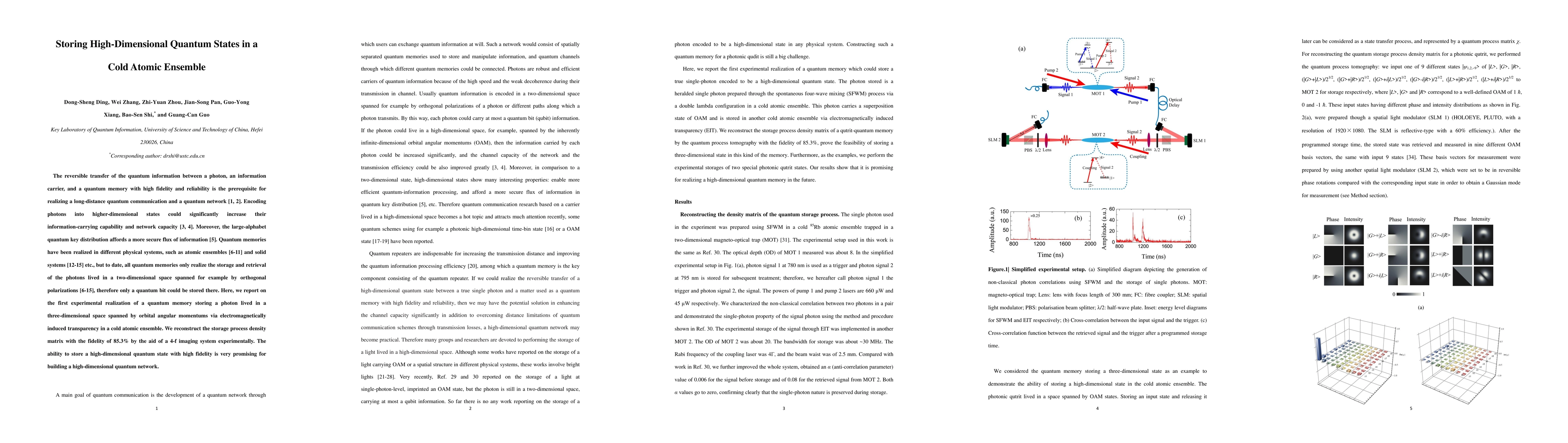 The reversible transfer of the quantum information between a photon, an information carrier, and a quantum memory with high fidelity and reliability is the prerequisite for realizing a long-distance quantum communication and a quantum network. Encoding photons into higher-dimensional states could significantly increase their information-carrying capability and network capacity. Moreover, the large-alphabet quantum key distribution affords a more secure flux of information. Quantum memories have been realized in different physical systems, such as atomic ensembles and solid systems etc., but to date, all quantum memories only realize the storage and retrieval of the photons lived in a two-dimensional space spanned for example by orthogonal polarizations, therefore only a quantum bit could be stored there. Here, we report on the first experimental realization of a quantum memory storing a photon lived in a three-dimensional space spanned by orbital angular momentums via electromagnetically induced transparency in a cold atomic ensemble. We reconstruct the storage process density matrix with the fidelity of 85.3% by the aid of a 4-f imaging system experimentally. The ability to store a high-dimensional quantum state with high fidelity is very promising for building a high-dimensional quantum network.