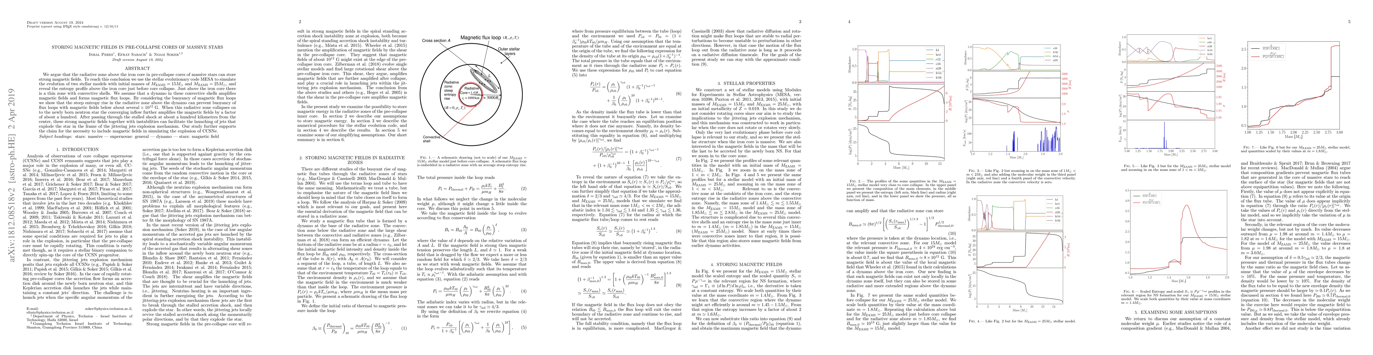 We argue that the radiative zone above the iron core in pre-collapse cores of massive stars can store strong magnetic fields. To reach this conclusion we use the stellar evolutionary code MESA to simulate the evolution of two stellar models with initial masses of 15Mo and 25Mo, and reveal the entropy profile above the iron core just before core collapse. Just above the iron core there is a thin zone with convective shells. We assume that a dynamo in these convective shells amplifies magnetic fields and forms magnetic flux loops. By considering the buoyancy of magnetic flux loops we show that the steep entropy rise in the radiative zone above the dynamo can prevent buoyancy of flux loops with magnetic fields below about 10^{13}G. When this radiative zone collapses on to the newly born neutron star the converging inflow further amplifies the magnetic fields by a factor of about a hundred. After passing through the stalled shock at about a hundred kilometres from the center, these strong magnetic fields together with instabilities can facilitate the launching of jets that explode the star in the frame of the jittering jets explosion mechanism. Our study further supports the claim for the necessity to include magnetic fields in simulating the explosion of CCSNe.