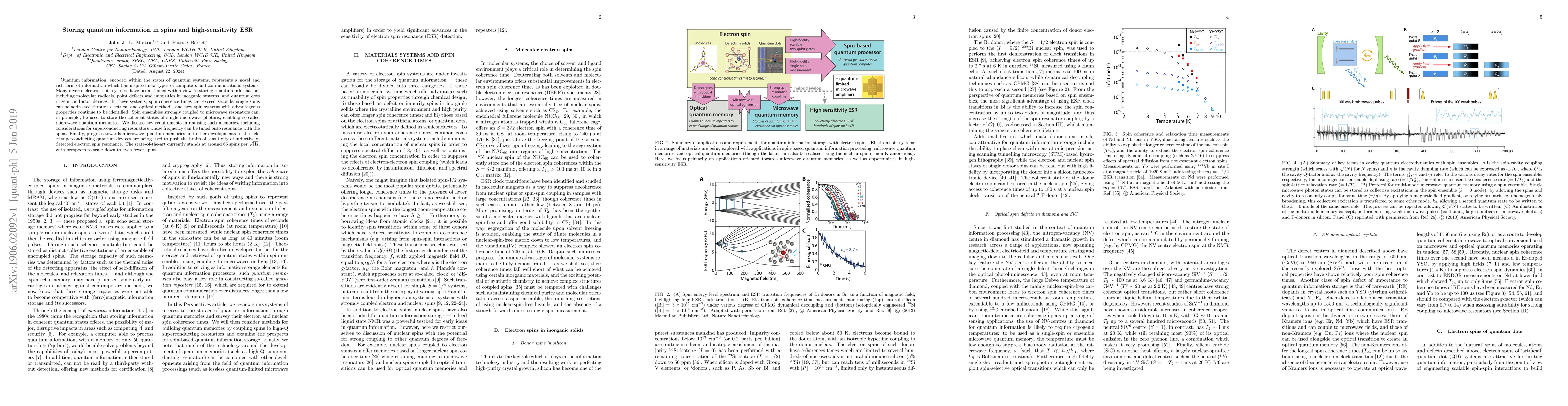 This paper explores the potential of electron spin systems for quantum information storage and advances in high-sensitivity electron spin resonance (ESR). It highlights the progress in developing microwave quantum memories using spin ensembles coupled to microwave resonators, and discusses the current sensitivity of inductively-detected ESR, which is approaching the detection of as few as 65 spins per root-Hz.