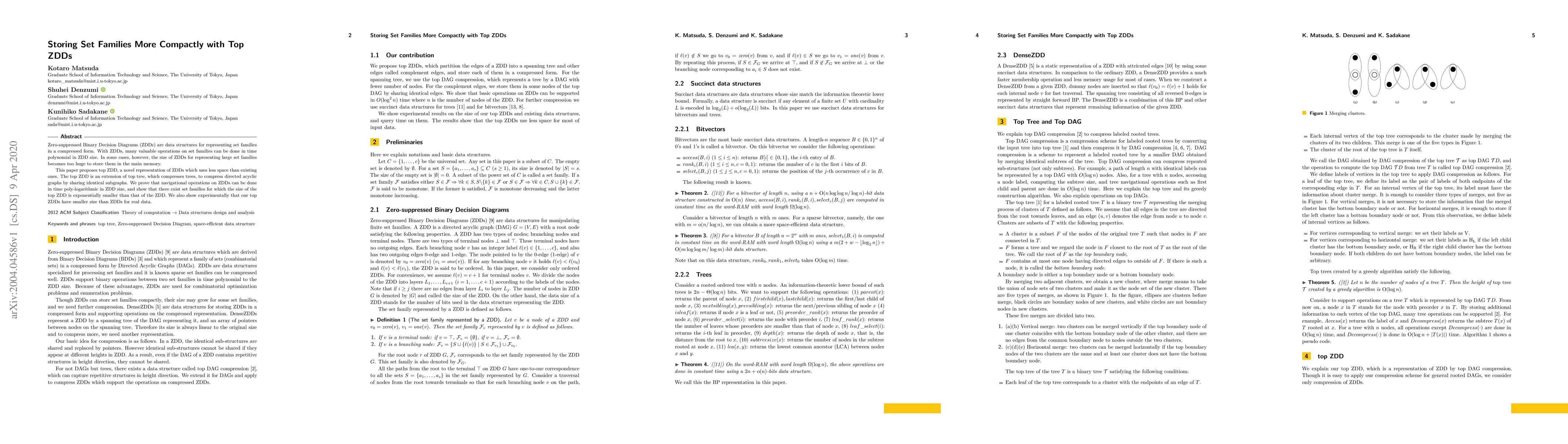 This paper introduces top ZDDs, a new method for more compactly storing set families using a novel extension of top trees to directed acyclic graphs. It demonstrates that top ZDDs can significantly reduce storage size compared to traditional ZDDs and perform navigational operations in poly-logarithmic time.