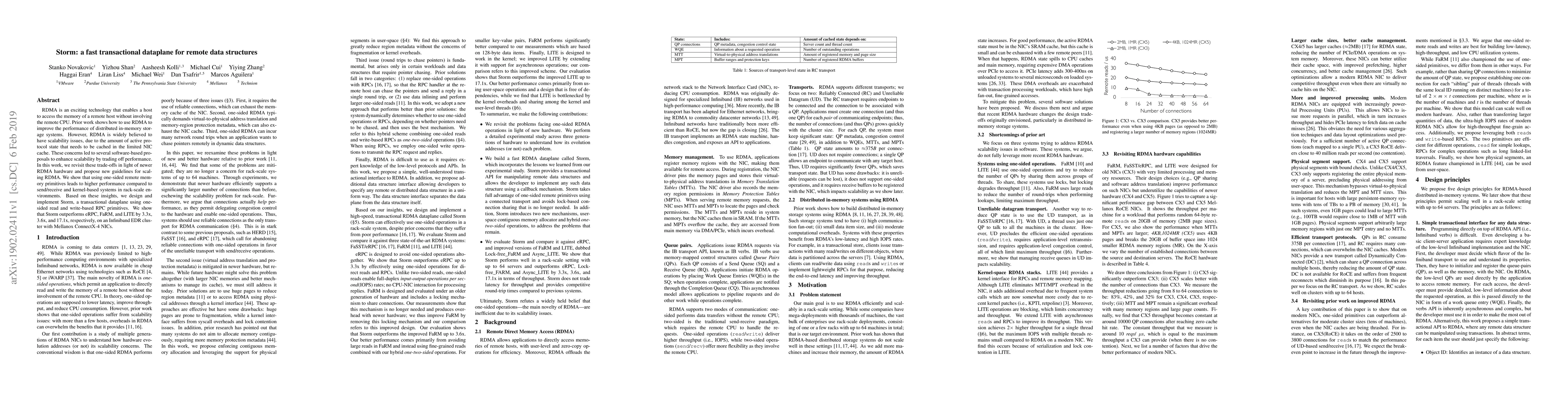 Storm leverages one-sided RDMA primitives to create a fast transactional dataplane for remote data structures, achieving superior performance over existing systems like eRPC, FaRM, and LITE in rack-scale environments. The design addresses scalability concerns by minimizing protocol state caching, leading to a 3.3x to 17.1x performance improvement.