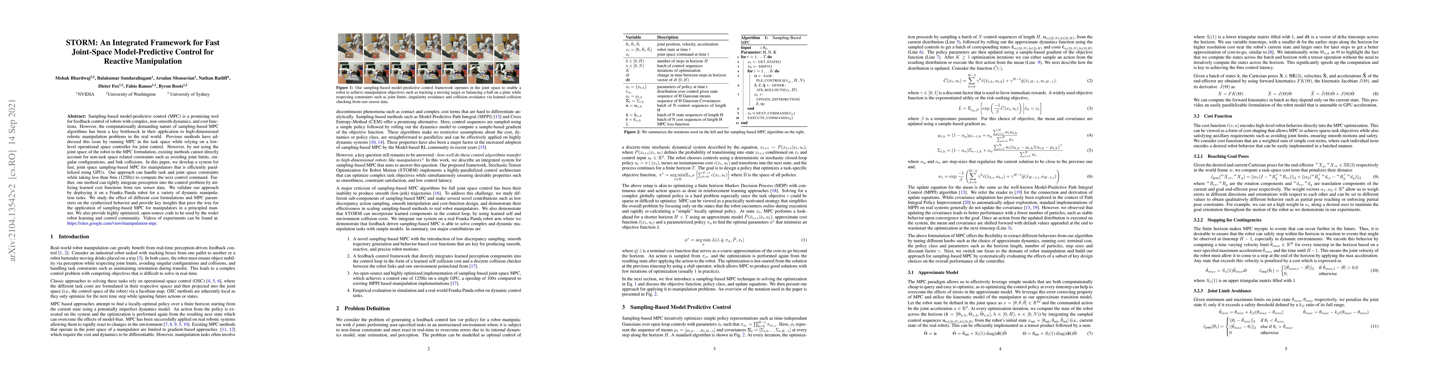 This paper introduces STORM, an integrated framework for fast joint-space model-predictive control (MPC) for reactive manipulation, efficiently parallelized using GPUs. The approach enables real-time computation of control commands while handling both task and joint space constraints, and integrates perception through learned cost functions.