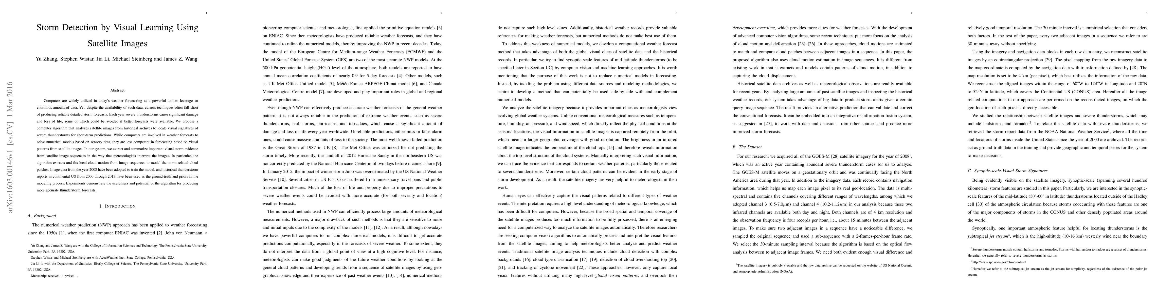 This paper proposes a computer algorithm that uses visual learning from satellite images to detect severe thunderstorms, aiming to improve storm forecasts. The algorithm analyzes historical satellite image data to identify visual storm signatures, showing potential for more accurate short-term thunderstorm predictions.