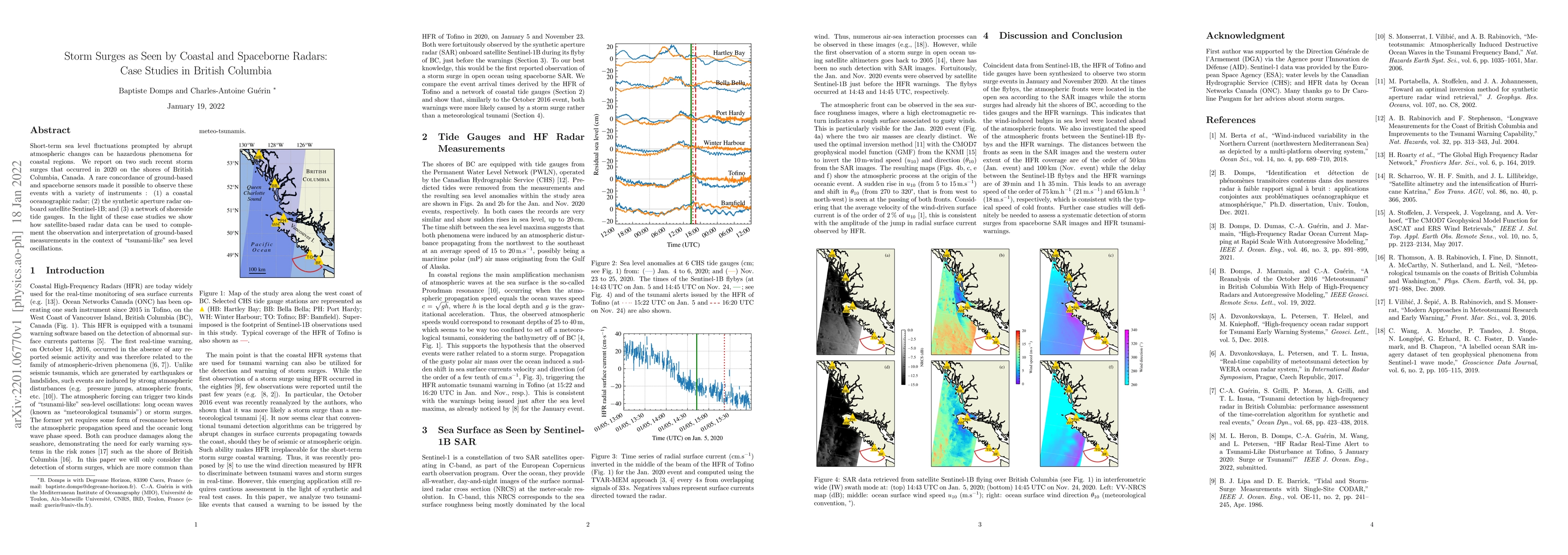 Short-term sea level fluctuations prompted by abrupt atmospheric changes can be hazardous phenomena for coastal regions. We report on two such recent storm surges that occurred in 2020 on the shores of British Columbia, Canada. A rare concordance of ground-based and spaceborne sensors made it possible to observe these events with a variety of instruments : (1) a coastal oceanographic radar; (2) the synthetic aperture radar onboard satellite Sentinel-1B; and (3) a network of shoreside tide gauges. In the light of these case studies we show how satellite-based radar data can be used to complement the observation and interpretation of ground-based measurements in the context of ``tsunami-like'' sea level oscillations.
