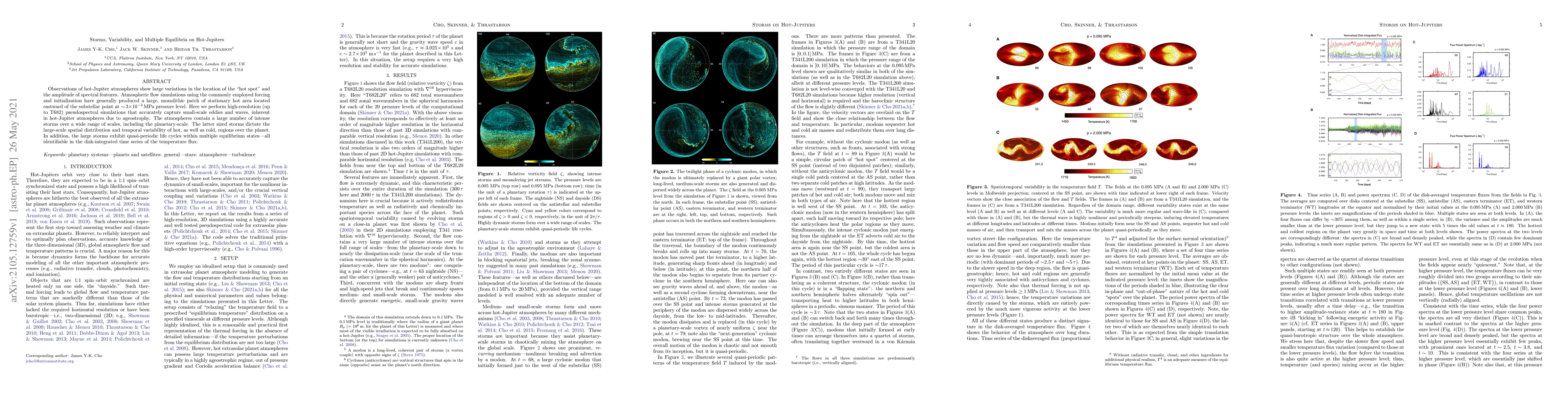 This paper investigates the variability in hot-Jupiter atmospheres through high-resolution simulations, revealing intense storms and multiple equilibrium states driven by planetary-scale storms, which dictate the spatial and temporal distribution of hot and cold regions. The simulations show that large storms exhibit quasi-periodic life cycles identifiable in the temperature flux time series.