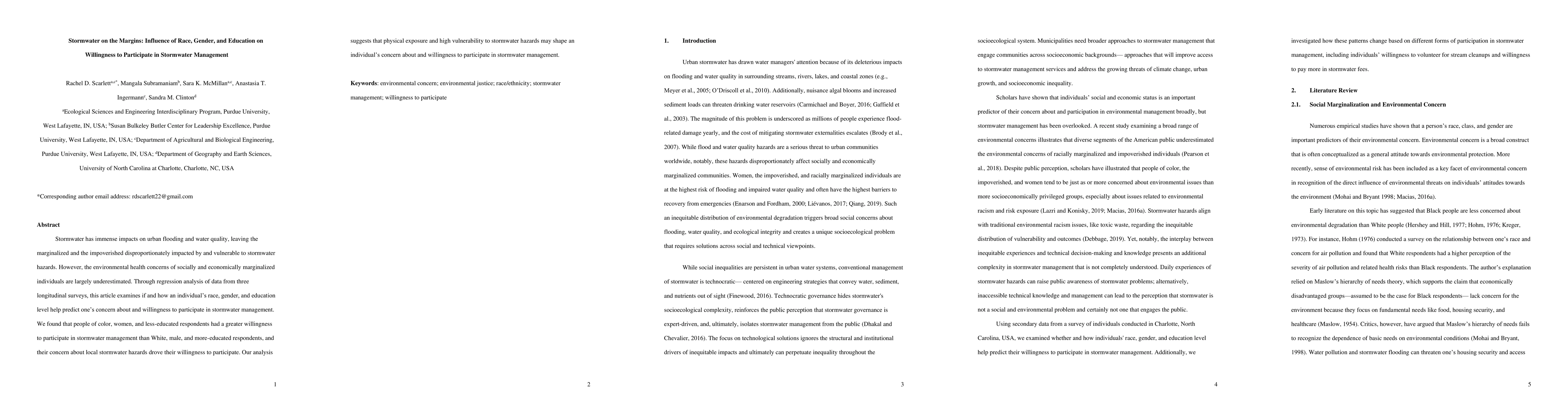 This study investigates the influence of race, gender, and education on willingness to participate in stormwater management, finding that people of color, women, and those with lower education levels are more willing to engage due to heightened concern about local stormwater hazards. The research highlights the disproportionate impact of stormwater on marginalized communities.