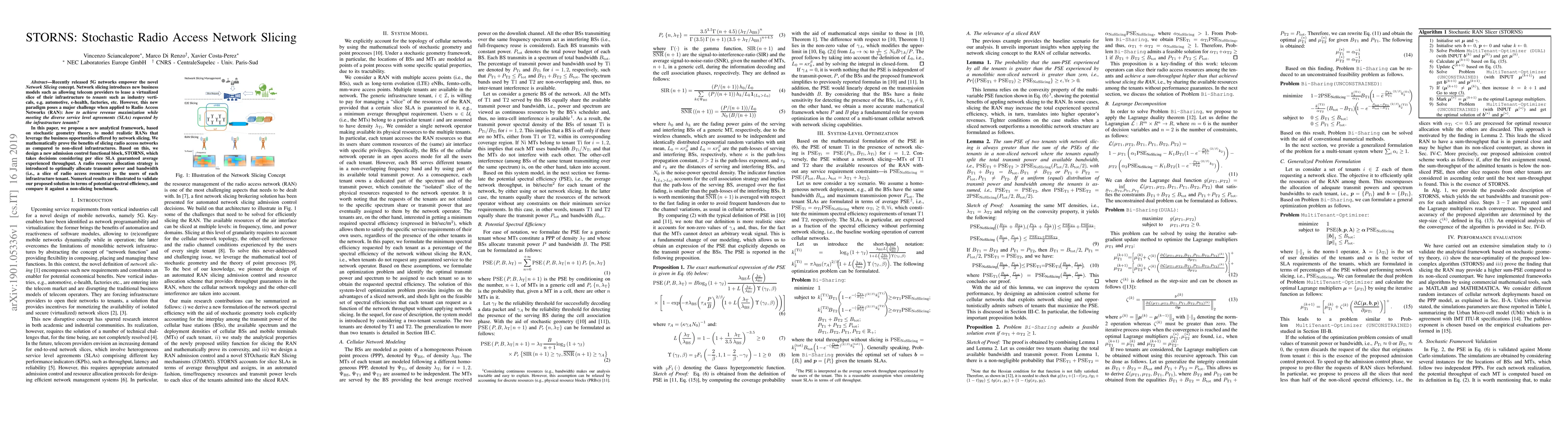Recently released 5G networks empower the novel Network Slicing concept. %which enables novel business models; Network slicing introduces new business models such as allowing telecom providers to lease a virtualized slice of their infrastructure to tenants such as industry verticals, e.g. automotive, e-health, factories, etc. However, this new paradigm poses a major challenge when applied to Radio Access Networks (RAN): how to achieve revenue maximization while meeting the diverse service level agreements (SLAs) requested by the infrastructure tenants? In this paper, we propose a new analytical framework, based on stochastic geometry theory, to model realistic RANs that leverage the business opportunities offered by network slicing. We mathematically prove the benefits of slicing radio access networks as compared to non-sliced infrastructures. Based on this, we design a new admission control functional block, STORNS, which takes decisions considering per slice SLA guaranteed average experienced throughput. A radio resource allocation strategy is introduced to optimally allocate transmit power and bandwidth (i.e., a slice of radio access resources) to the users of each infrastructure tenant. Numerical results are illustrated to validate our proposed solution in terms of potential spectral efficiency, and compare it against a non-slicing benchmark.