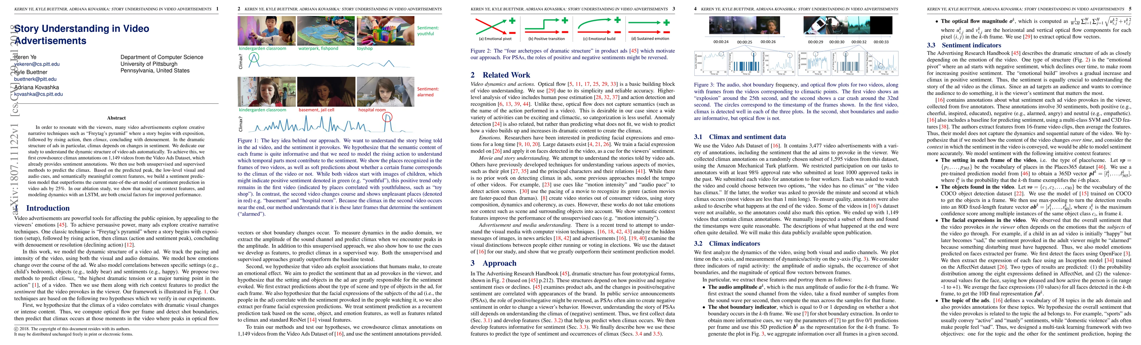 In order to resonate with the viewers, many video advertisements explore creative narrative techniques such as "Freytag's pyramid" where a story begins with exposition, followed by rising action, then climax, concluding with denouement. In the dramatic structure of ads in particular, climax depends on changes in sentiment. We dedicate our study to understand the dynamic structure of video ads automatically. To achieve this, we first crowdsource climax annotations on 1,149 videos from the Video Ads Dataset, which already provides sentiment annotations. We then use both unsupervised and supervised methods to predict the climax. Based on the predicted peak, the low-level visual and audio cues, and semantically meaningful context features, we build a sentiment prediction model that outperforms the current state-of-the-art model of sentiment prediction in video ads by 25%. In our ablation study, we show that using our context features, and modeling dynamics with an LSTM, are both crucial factors for improved performance.